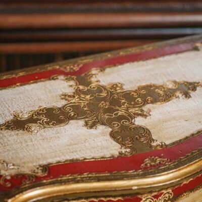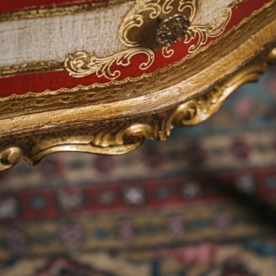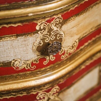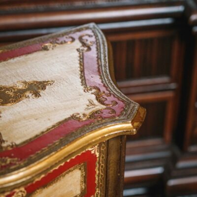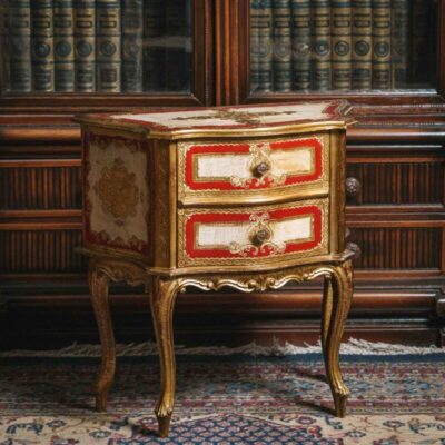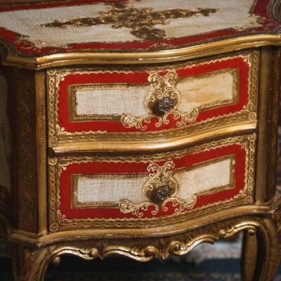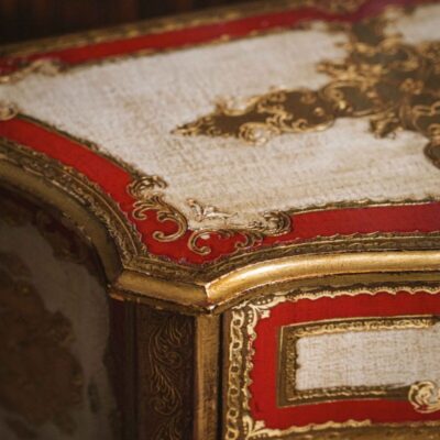 Роскошный антикварный комод-столик в стиле Наполеона III. Этот предмет мебели отличается плавными, изогнутыми линиями, характерными для этого стиля. Столешница и корпус украшены тончайшей инкрустацией из разных пород дерева (маркетри), создающей изящный геометрический узор. Самой яркой деталью являются резные элементы из позолоченной бронзы — накладки, ручка ящика и сабо на ножках, которые подчёркивают его высокий статус и безупречный вкус. Этот комод станет изысканным акцентом в гостиной, спальне или кабинете.