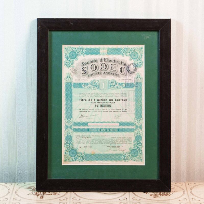 Сам бланк выполнен в изысканном декоративном стиле с характерной типографикой и орнаментом, свойственными европейским ценным бумагам первой половины XX века. Сегодня такие документы ценятся не только как свидетельства истории бизнеса и энергетики, но и как эффектные предметы интерьера. Благодаря гармоничному сочетанию светлого фона, бирюзового орнамента и тёмной рамы этот предмет выглядит особенно выразительно и может стать стильным акцентом в кабинете, библиотеке, офисе или коллекционном пространстве. Исторические акции и облигации подобного типа также относятся к сфере коллекционирования старинных ценных бумаг.