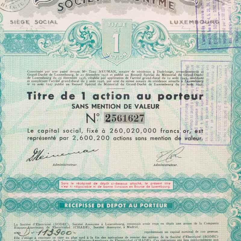 Элегантно оформленная старинная ценная бумага Societe d’Electricite SODEC представляет собой интересный образец европейской финансовой и промышленной истории. Компания Société d’Electricité (SODEC) была зарегистрирована в Люксембурге 20 декабря 1938 года. Согласно официальному люксембургскому акту 1939 года, в неё был внесён актив Compania Hispano-Americana de Electricidad, что связывает SODEC с электроэнергетическим сектором и международными корпоративными структурами того времени.