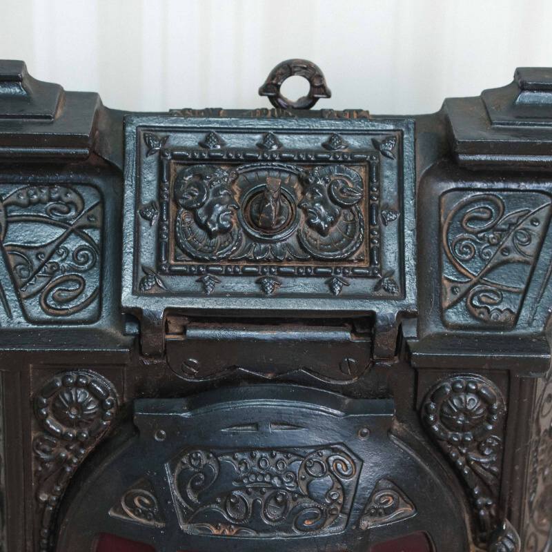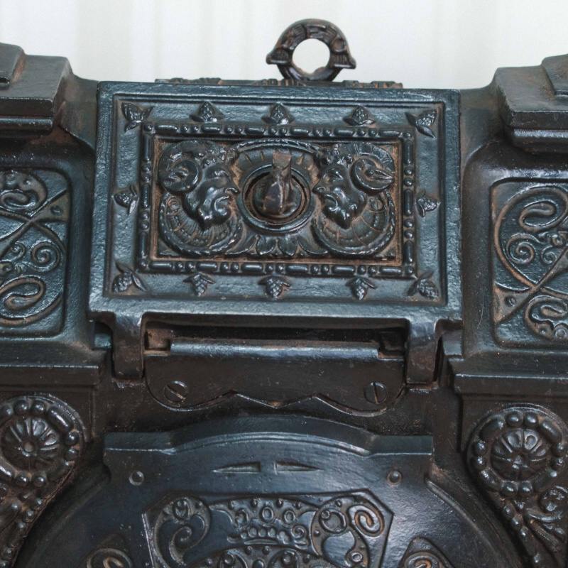 Корпус выполнен из массивного чугуна с характерным глубоким тоном и богато украшен рельефным орнаментом в духе неоренессанса: растительными завитками, маскаронами и архитектурными элементами, придающими печи монументальность и изящество.