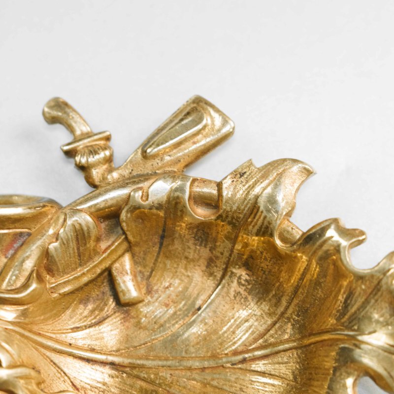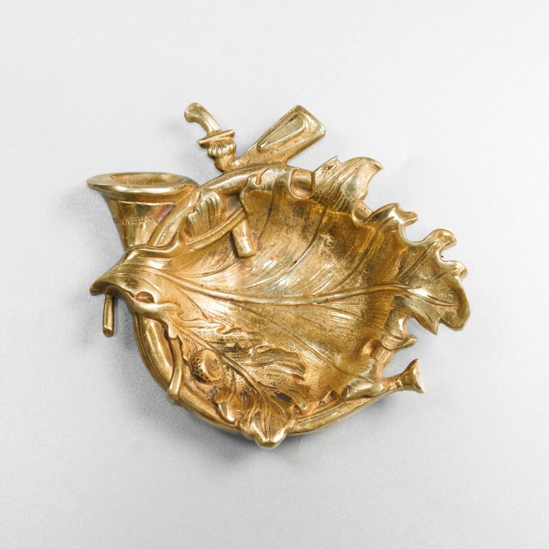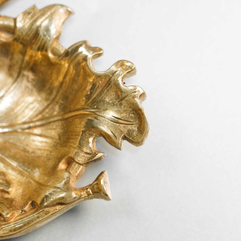 Пепельница изготовлена из латуни тёплого золотистого оттенка, который со временем приобрёл характерную патину, придающую предмету благородство и исторический шарм. Небольшое углубление в форме листа служит рабочей частью изделия, а края обеспечивают удобное размещение курительных принадлежностей.