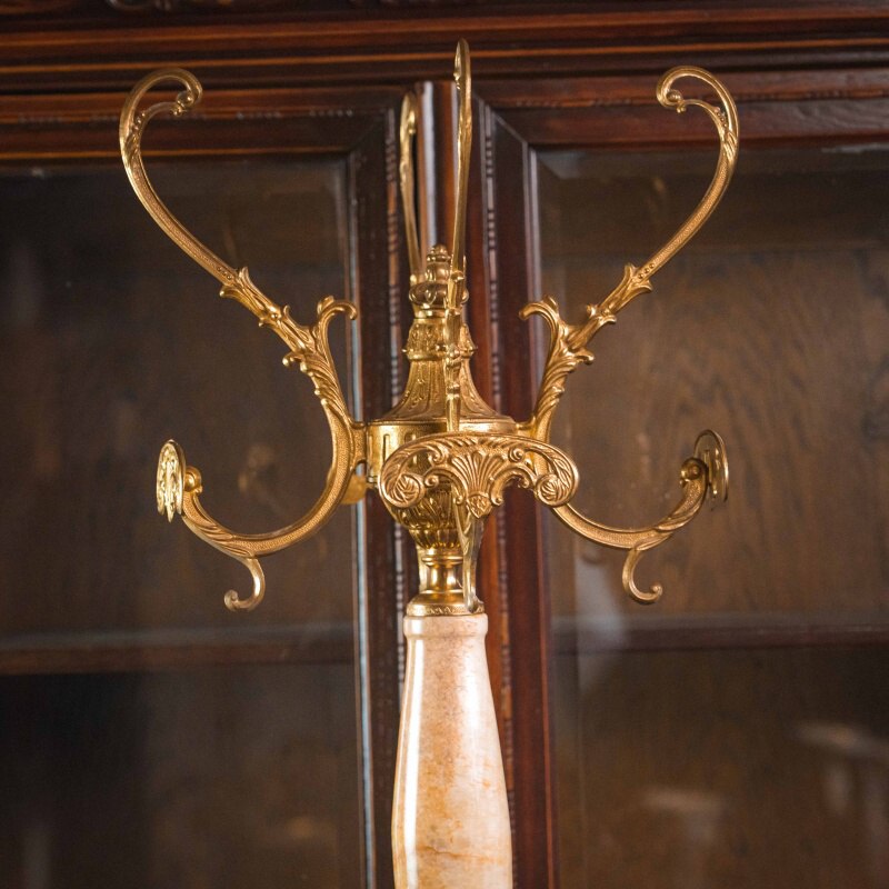 Такие вешалки часто встречались в интерьерах аристократических особняков и городских салонов, где они служили показателем статуса владельца. В сочетании с натуральным камнем и благородным металлом этот предмет обладает высокой коллекционной ценностью и способен украсить классический кабинет, гостиную или роскошный холл.