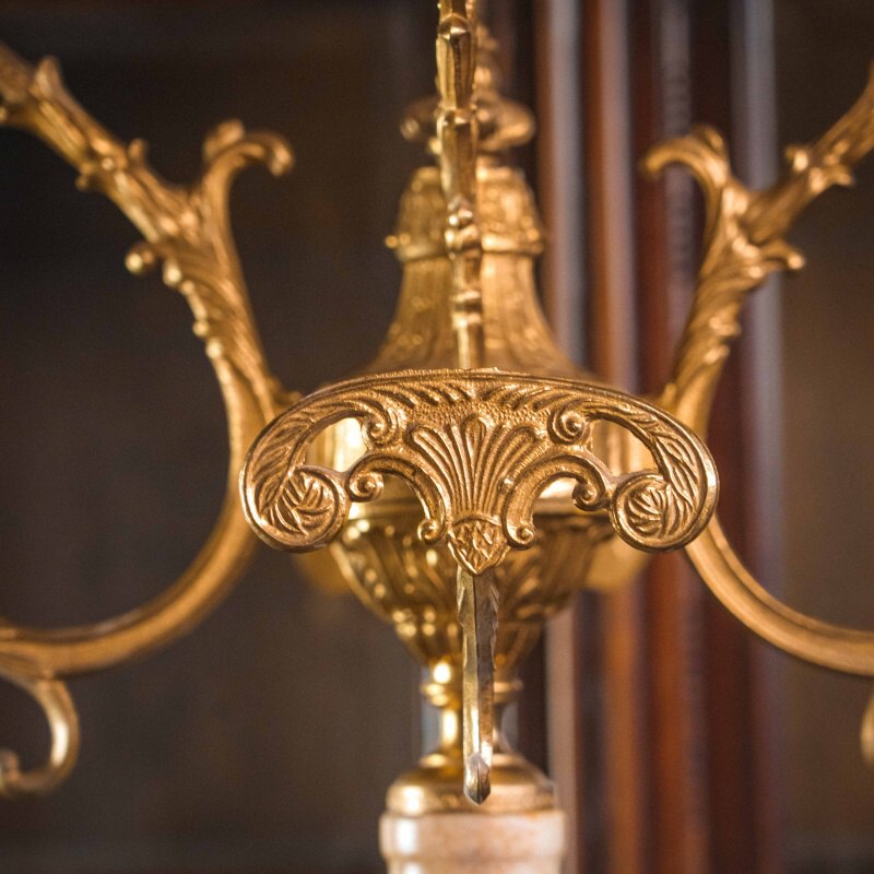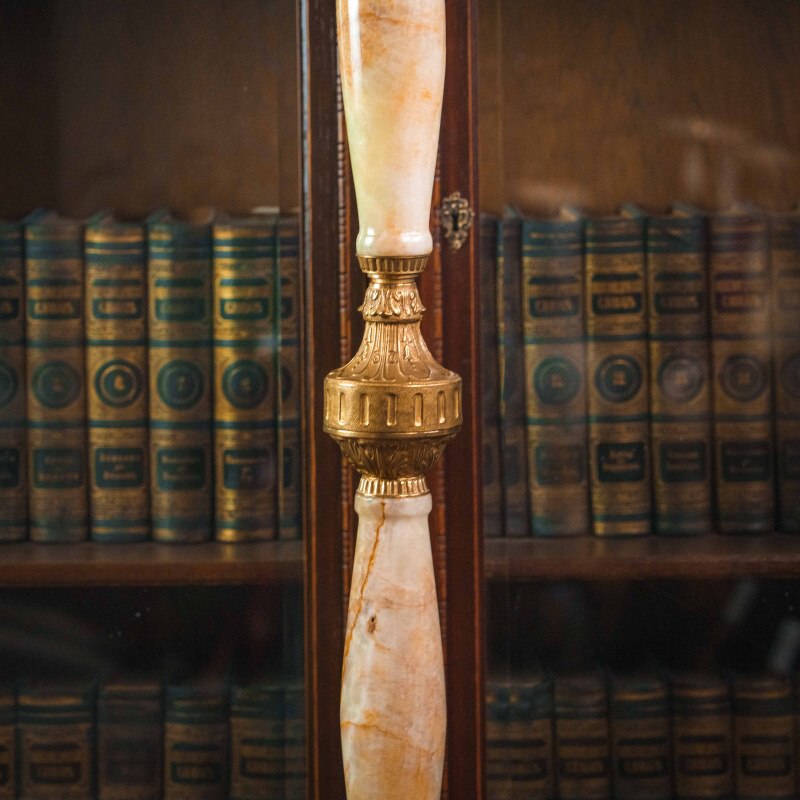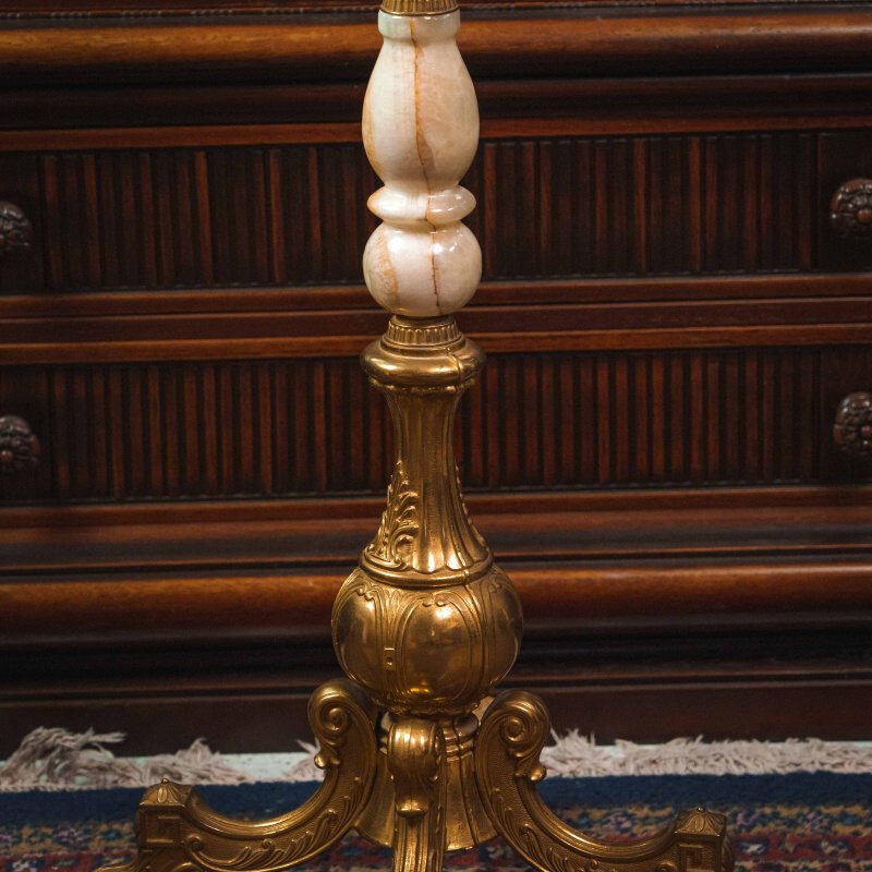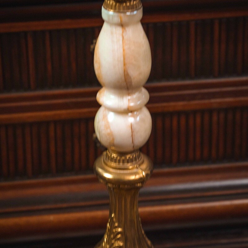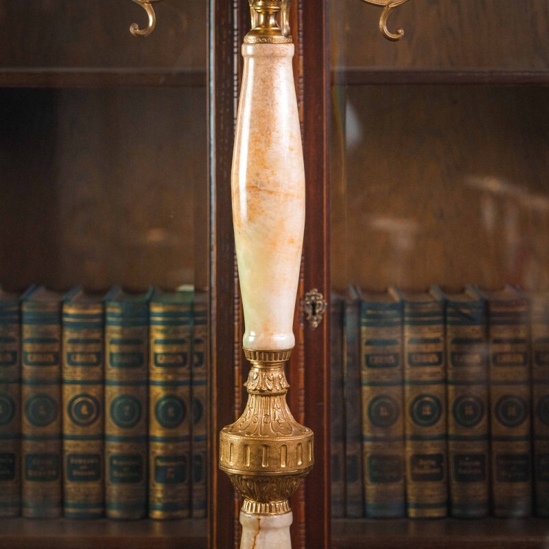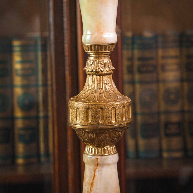 Центральная стойка состоит из крупных вставок натурального оникса — полудрагоценного камня, известного своей многоцветной природной структурой и благородной полупрозрачностью. Мягкие переходы кремовых и персиковых тонов создают ощущение тёплого свечения, словно внутри камня играет свет. Ониксовые сегменты гармонично сочетаются с литой бронзой, которая обрамляет элементы стойки и украшает её изысканными деталями.