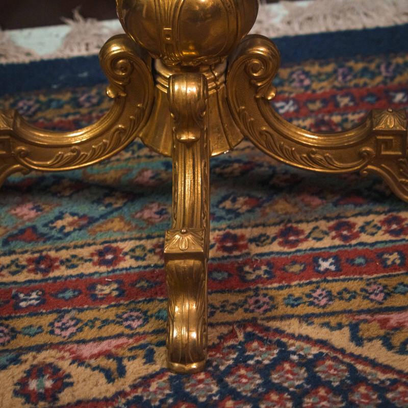 Нижняя часть опирается на массивное бронзовое основание с тремя изящными ножками, украшенными резными элементами в виде стилизованных лап и акантовых мотивов. Основание обеспечивает устойчивость конструкции и подчёркивает её декоративную ценность.