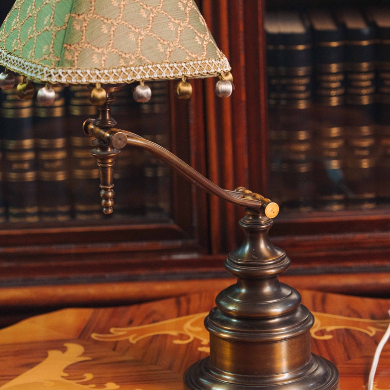 Основание выполнено из металла с благородной патиной, форма отличается классическими пропорциями и устойчивостью. Поворотный рычаг придаёт лампе особую функциональность и делает её практичным элементом интерьера.