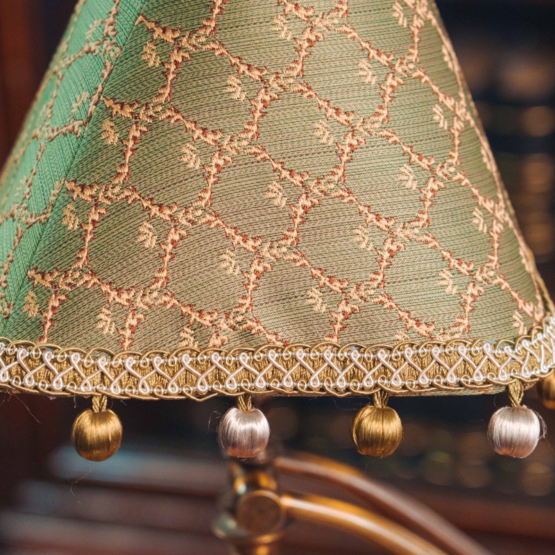 Абажур из текстиля мягкого зелёного оттенка украшен декоративным узором и бахромой, создавая тёплый рассеянный свет и атмосферу уюта. Лампа гармонично впишется в интерьер кабинета, библиотеки или гостиной.