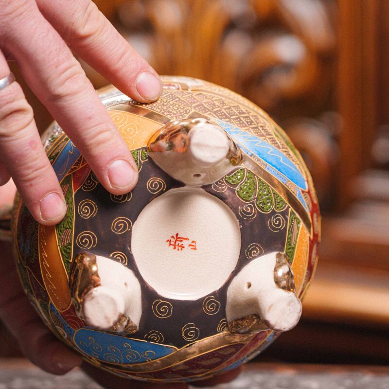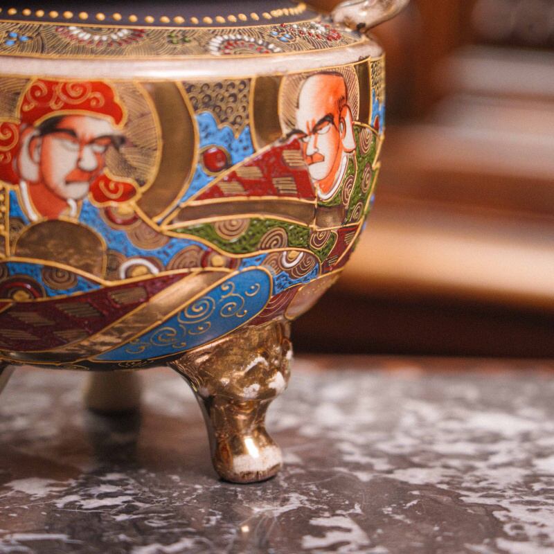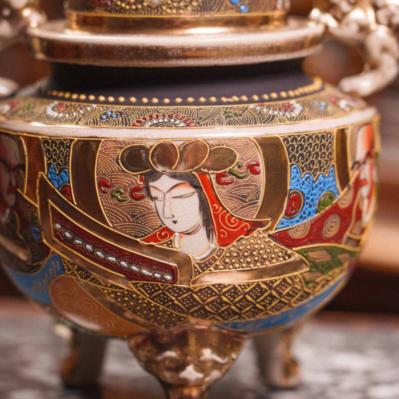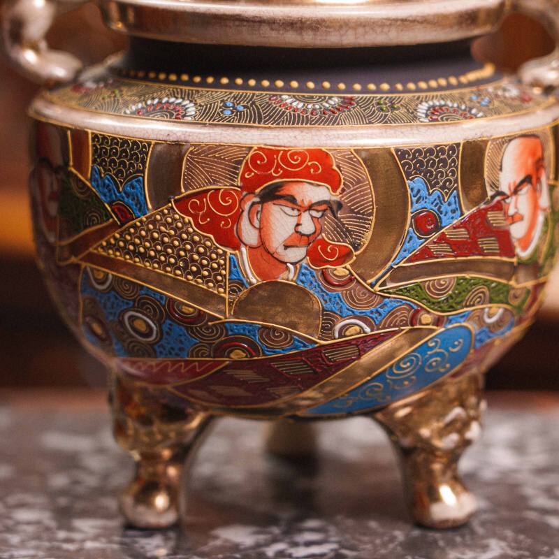 Изящный предмет декоративно-прикладного искусства, выполненный в традиционной японской технике сацума с богатой ручной росписью и обильным золочением. Корпус украшен многофигурными сценами с придворными персонажами в торжественных одеждах, характерных для классической иконографии Японии конца эпохи Мэйдзи — начала Тайсё. Лица, орнаменты и элементы костюмов проработаны с высокой детализацией, что подчёркивает мастерство художника.