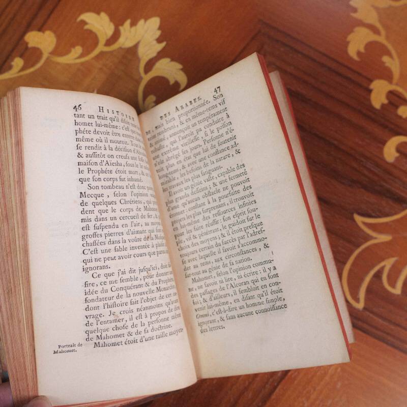 Первое издание масштабного исторического труда, который в полном виде состоит из 4 томов. Работа аббата де Мариньи считается одной из самых подробных и качественных историй исламских халифатов, написанных в XVIII веке. Она охватывает период развития арабского мира после смерти пророка Мухаммеда, включая правление Омейядов и Аббасидов. В книге также приводится генеалогия Мухаммеда и хронологические таблицы правителей.