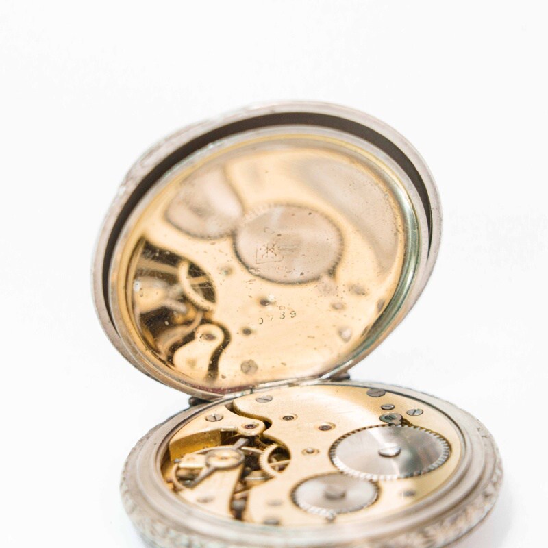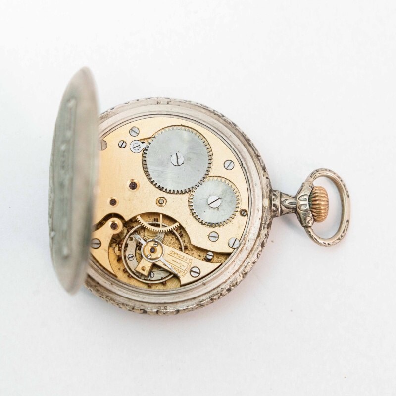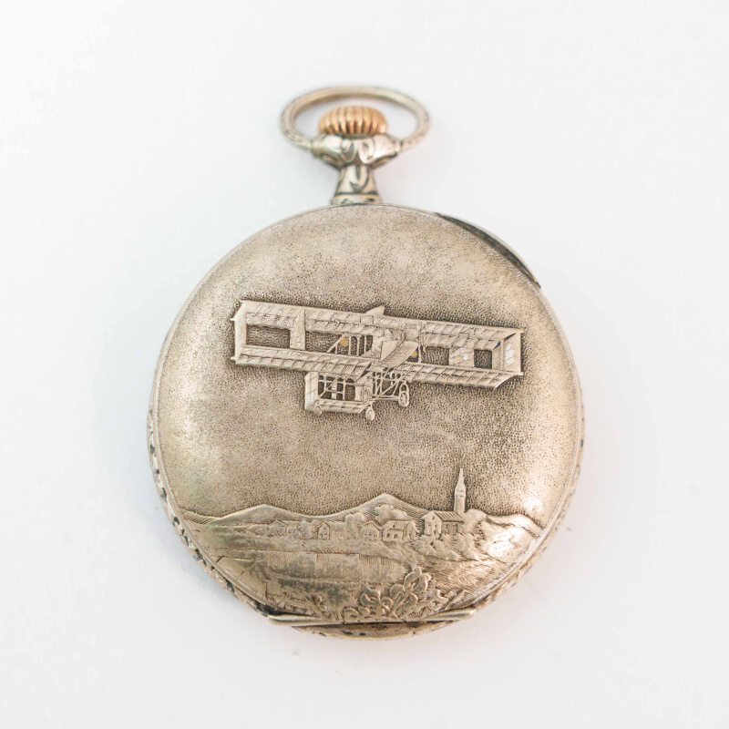 Эта фабрика была знаменита своими высококачественными корпусами с рельефными изображениями, выполненными методом штамповки и последующей ручной доработки. Изображение биплана над сельской местностью — это классический сюжет эпохи «Belle Époque» «пионеров авиации» — Прекрасной эпохи. В начале XX века авиация была главным символом прогресса, и такие часы часто назывались «авиационными» или «пропагандистскими». Солидный вес для часов диаметра 50 мм., что характерно для качественных серебряных корпусов (в 800-й пробы).