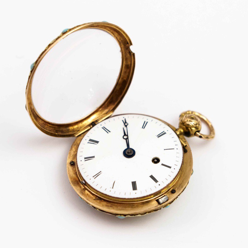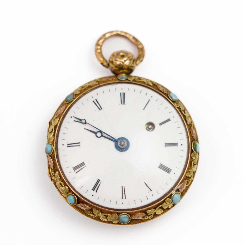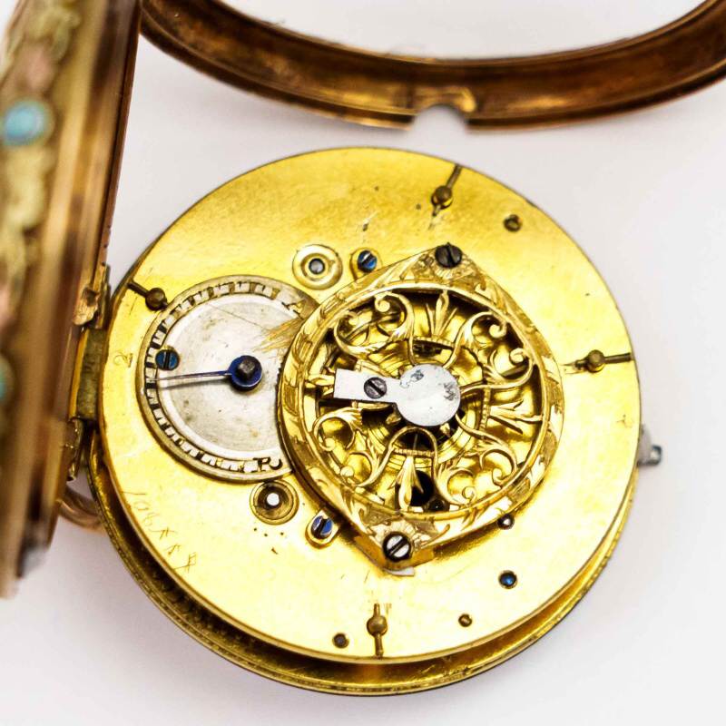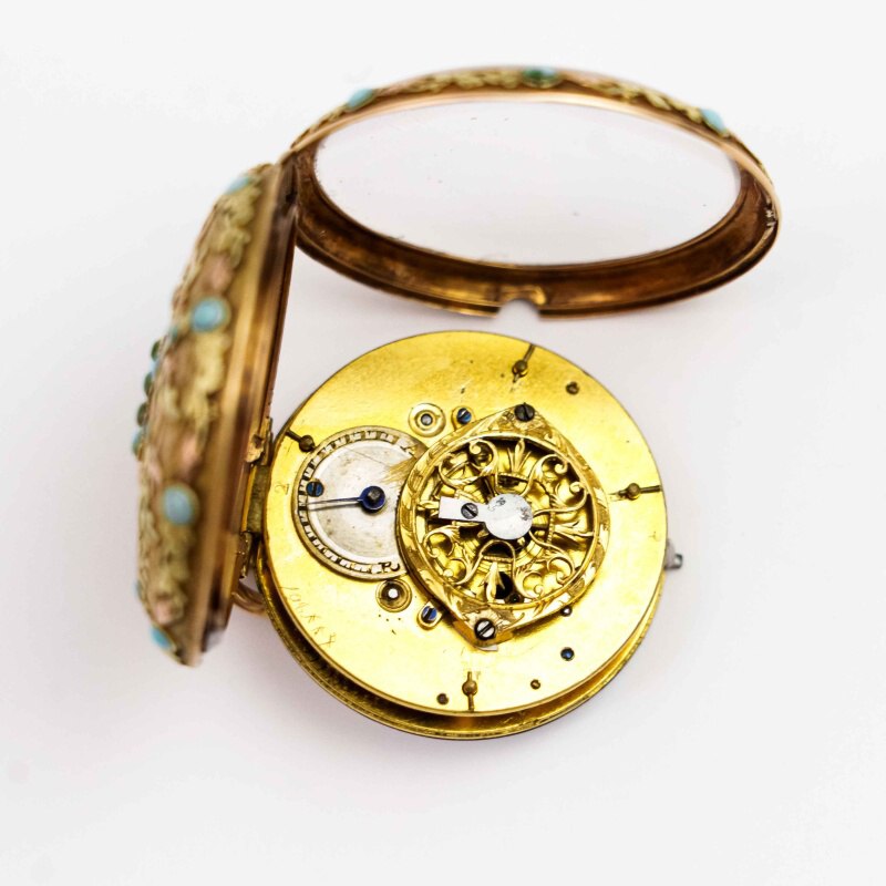 Материал Шпиндельный механизм (Verge Fusee) с цепным приводом. «Золото трех цветов» (Or de trois couleurs). Вставки из натуральной бирюзы.