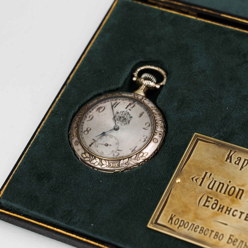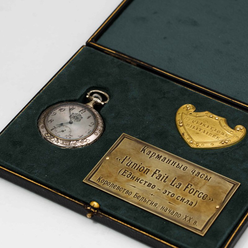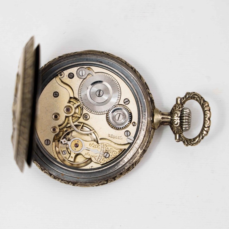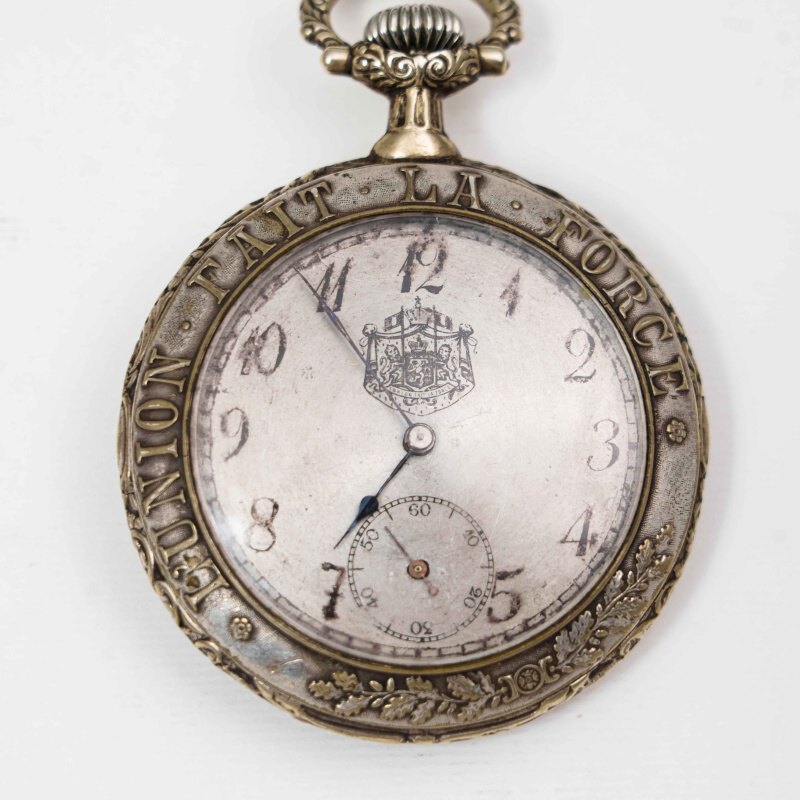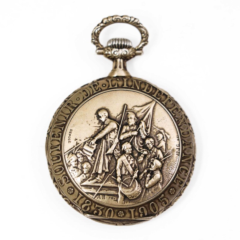 Антикварные карманные часы выпущенные в Память о независимости Франции. 1830-1905. Металлический посеребренный корпус с надписью по гурту «l’union fait la force» — «единство — это сила», и рельефным изображением исторической сцены с несколькими фигурами на задней крышке. В центре композиции — мужчина в военной одежде и группа людей вокруг него, включая знаменосца и барабанщика. Сцена изображает события, связанные с борьбой за независимость Франции. По окружности рельефа расположена надпись «SOUVENIR DE L’INDEPENDANCE» (Сувенир Независимости), а в нижней части — даты «1830-1905».