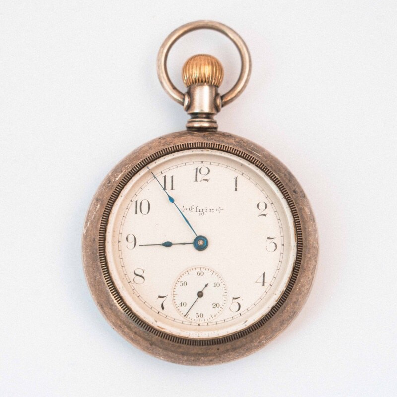 Антикварные карманные часы Elgin National Watch Company. Это классические американские часы, произведенные в начале XX века в городе Элгин, штат Иллинойс. Серийный номер 9434079, выгравированный на механизме ваших часов, позволяет точно определить время их производства — 1901–1902 гг. Белый эмалевый циферблат с арабскими цифрами и дополнительным секундным циферблатом в положении «6 часов».