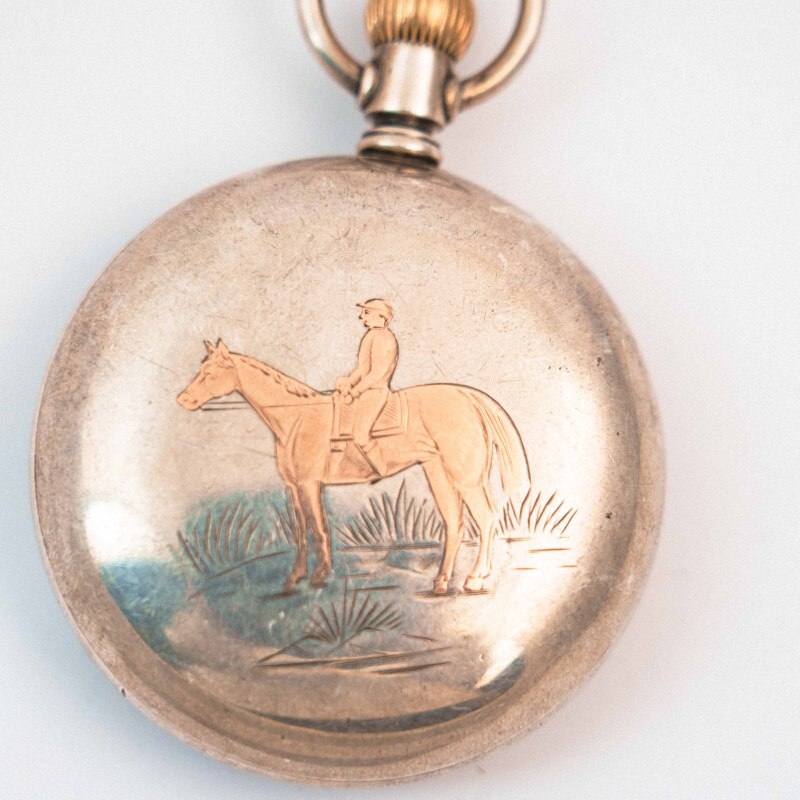 На задней крышке выгравировано изображение всадника на лошади. Такое художественное оформление задней крышки было популярно в эпоху охотничьих и спортивных сюжетов. Гравировка на серебре сохраняется гораздо лучше, чем на позолоте, и со временем приобретает благородную патину.