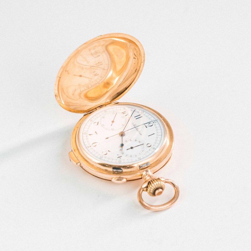 Мужские, антикварные золотые карманные часы с усложнениями (Grand Complications) — «Initiative». Швейцария, конец XIX — начало XX века (ок. 1890–1910 гг.). «Савонетта» (Savonette) — трехкрышечный корпус с откидной передней крышкой. Золото 18 карат (750 проба). Это высший стандарт качества для того времени. Массивные часы общим весом 106 грамм.Три золотые крышки (передняя, задняя и внутренний пыльник), обеспечивающие максимальную защиту механизма от пыли. Данные часы объединяют в себе две редкие функции, которые до сих пор считаются вершиной часового искусства: Четвертной репетир (Repetition à Quarts): Механический «аудио-календарь». При нажатии на рычаг (слайдер) на боку корпуса часы отбивают время звуком: Низкий тон — количество часов. Двойной удар (динь-дон) — количество прошедших четвертей часа (15, 30 или 45 минут).
