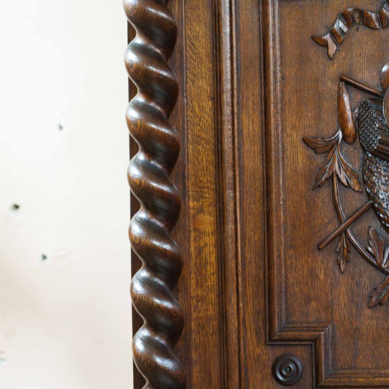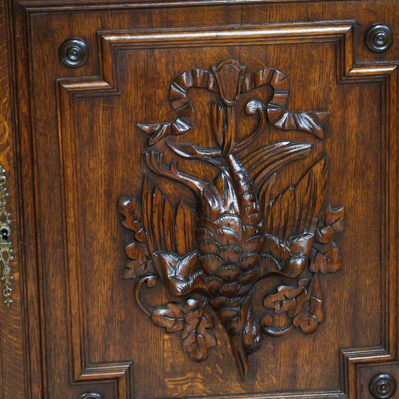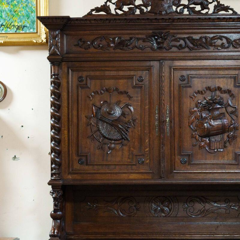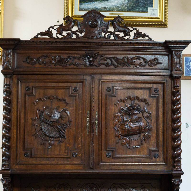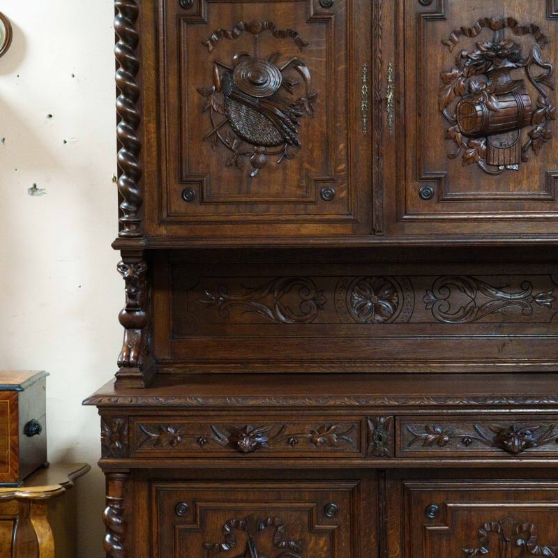 Конструкция буфета состоит из массивного нижнего отделения и более узкого верхнего отделения с резным карнизом, установленного на открытой полке, изготовлен из массива дуба, что придает ему солидность и внушительный вид. Фасад обильно украшен глубокой ручной резьбой с классическими для Ренессанса мотивами. Верхние и нижние дверцы украшены резными медальонами с изображениями охотничьих трофеев или стилизованных животных/растений и обрамлены фигурной резьбой. По бокам расположены витые колонны (или «соломоновы колонны»), которые эффектно обрамляют центральные секции.