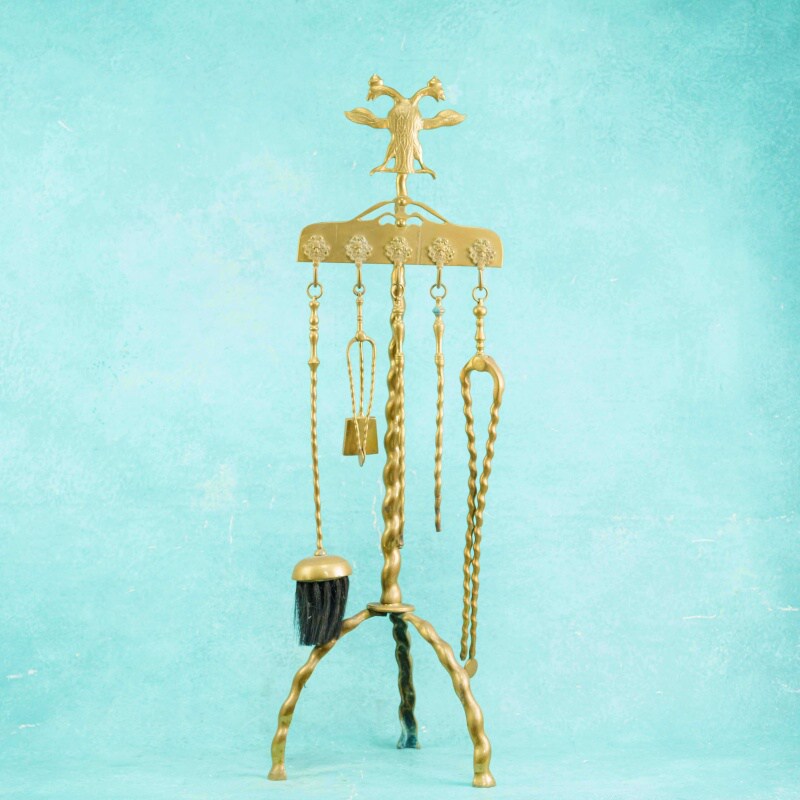 Элегантный латунный набор каминных инструментов, выполненный в традициях европейского художественного литья конца XIX – начала XX века. Центральный декоративный элемент — изящное навершие в виде двуглавого орла, символа власти, достоинства и благородства, который часто встречался в оформлении парадных интерьеров того времени.