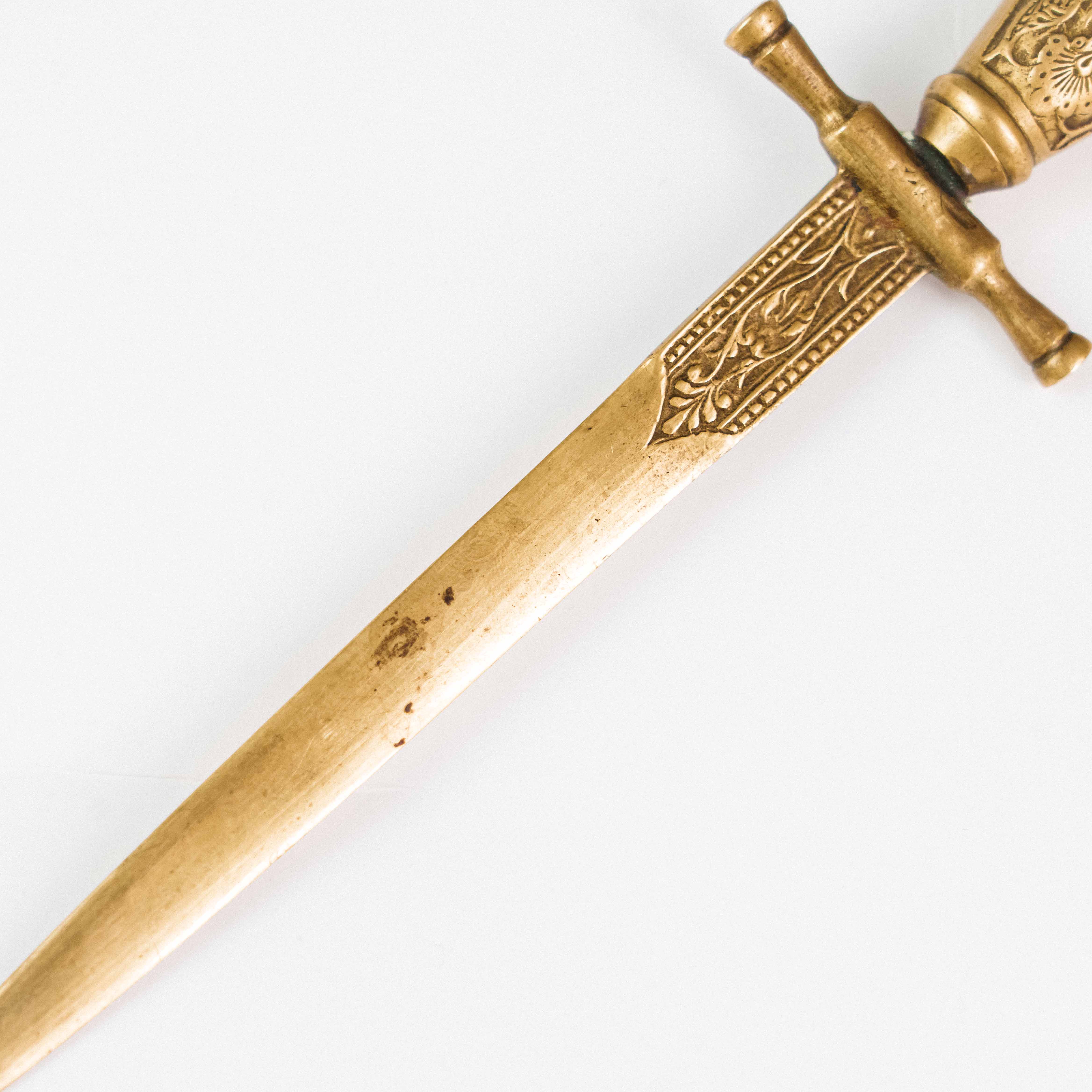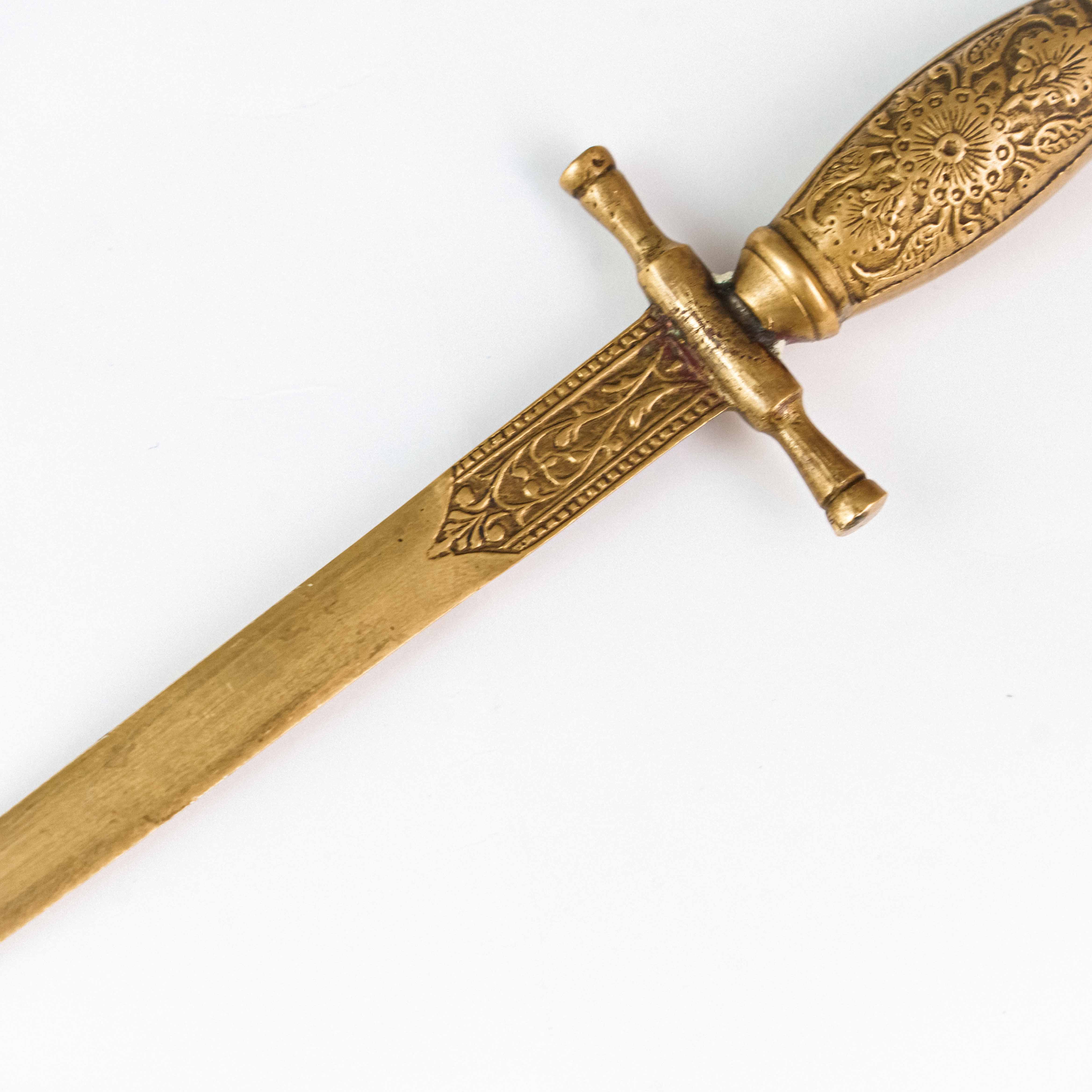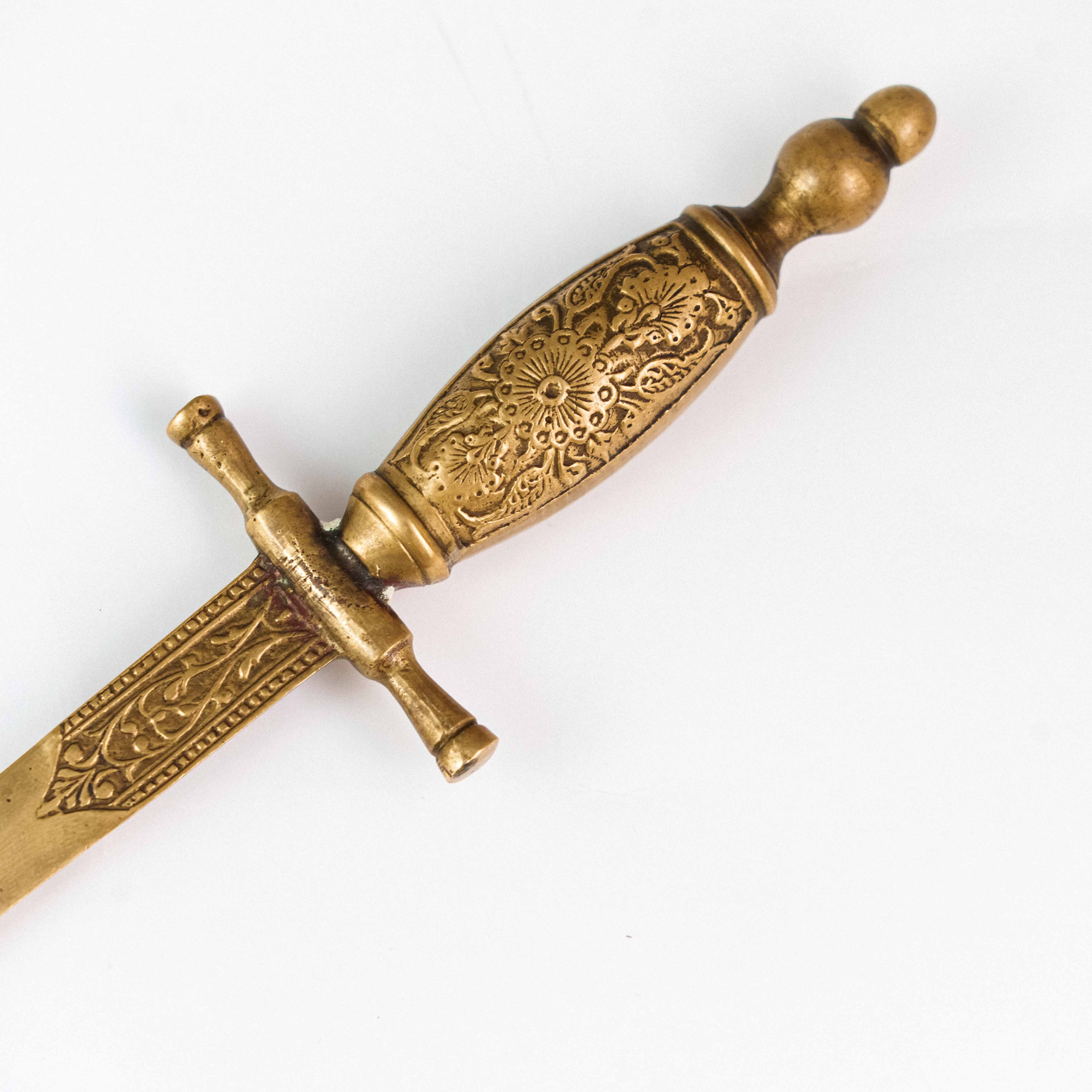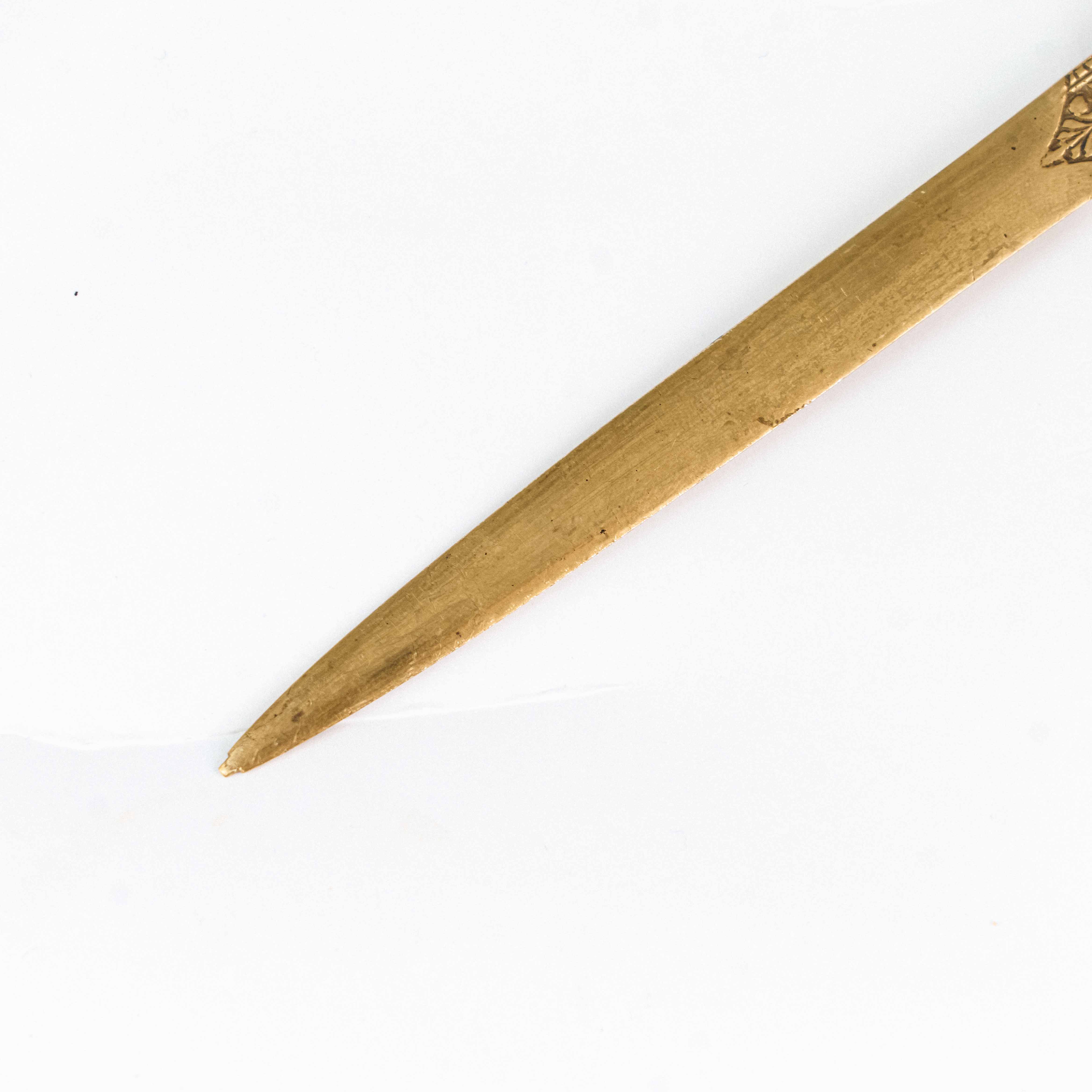 Этот изящный предмет выполнен в форме миниатюрного кинжала и гармонично соединяет практическое назначение с эстетикой антикварного декоративного искусства. Рукоять и крестовина богато орнаментированы: поверхность украшена тонкой гравировкой с растительными и геометрическими мотивами, характерными для парадных и подарочных изделий XIX века.