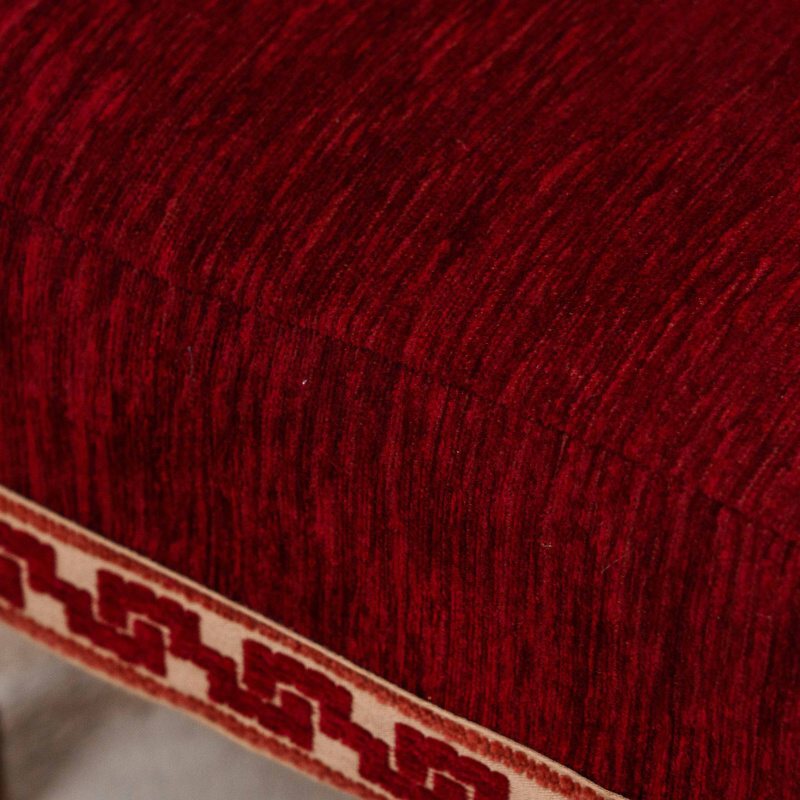 Мягкое сиденье обтянуто бархатистой тканью насыщенного бордового цвета, украшенной декоративной тесьмой с геометрическим орнаментом в античном стиле. Благодаря плотной набивке и прочной конструкции пуфик обеспечивает комфорт при использовании и остаётся устойчивым даже при длительной эксплуатации.