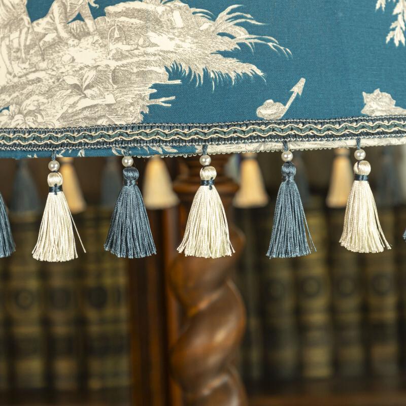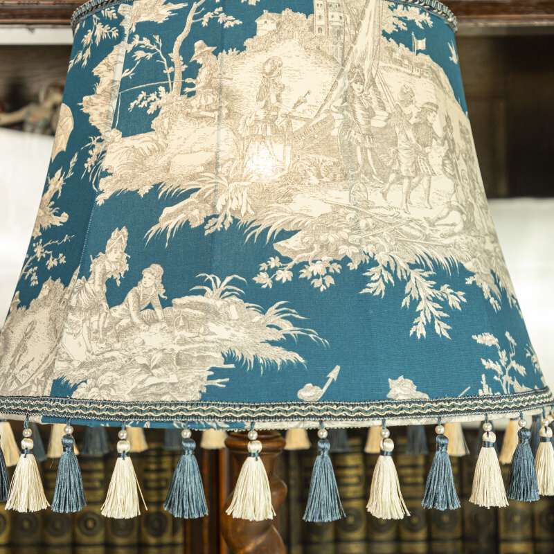 Пышное основание с крупной рельефной резьбой придаёт конструкции устойчивость и подчёркивает её художественную ценность. Абажур изготовлен из плотного текстиля с пасторальным мотивом на бирюзовом фоне и украшен кистями, что создаёт атмосферу французской аристократичности и камерного уюта.