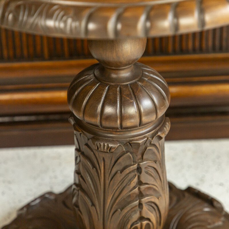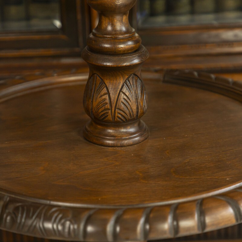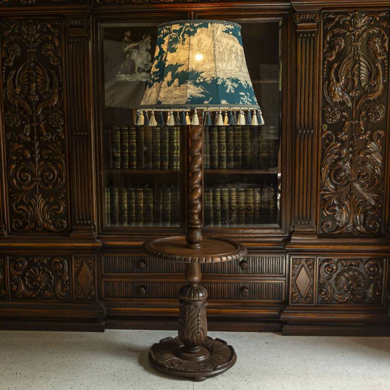Редкий и выразительный антикварный торшер, выполненный полностью из массива дерева и украшенный сложной ручной резьбой. Центральный стержень выполнен в виде скрученной колонны, которая символизирует вечное движение и визуально придаёт лёгкость всей конструкции. В нижней части встроен круглый столик с зубчатым краем и резным основанием — функциональный и эстетически выверенный элемент.