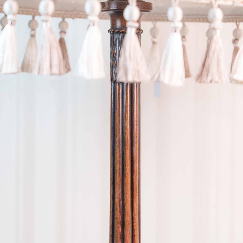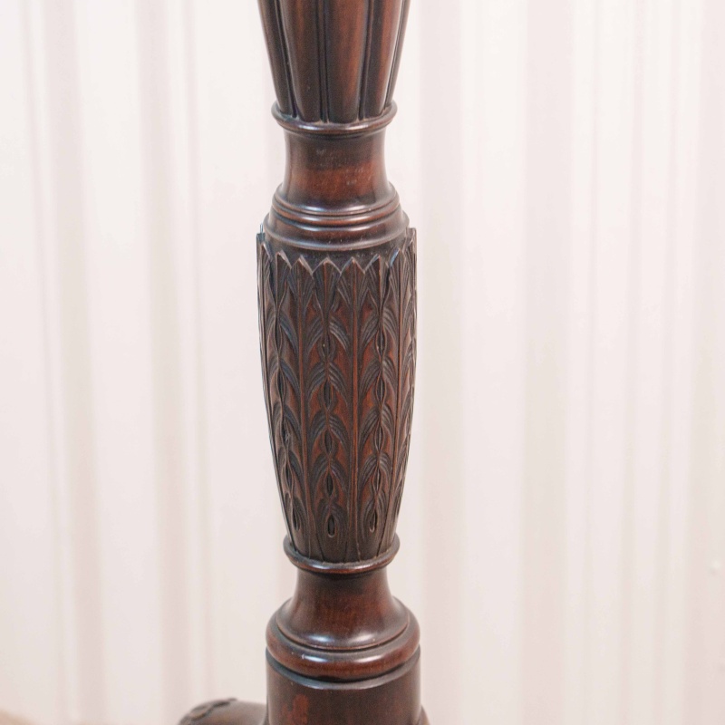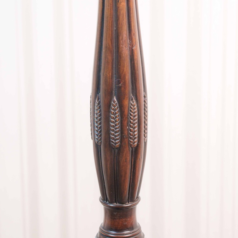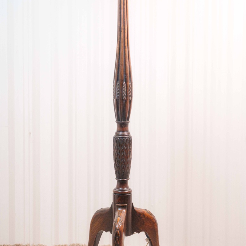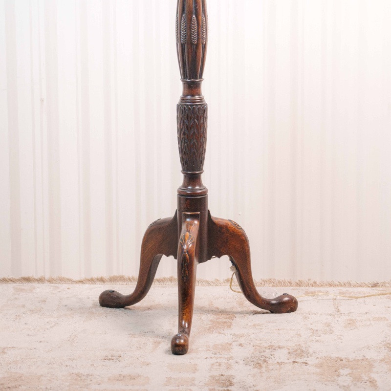 Элегантный антикварный торшер из дерева станет изысканным украшением классического интерьера. Высокая стройная стойка с декоративной резьбой и изящное основание на трёх ножках придают предмету утончённый и благородный вид.