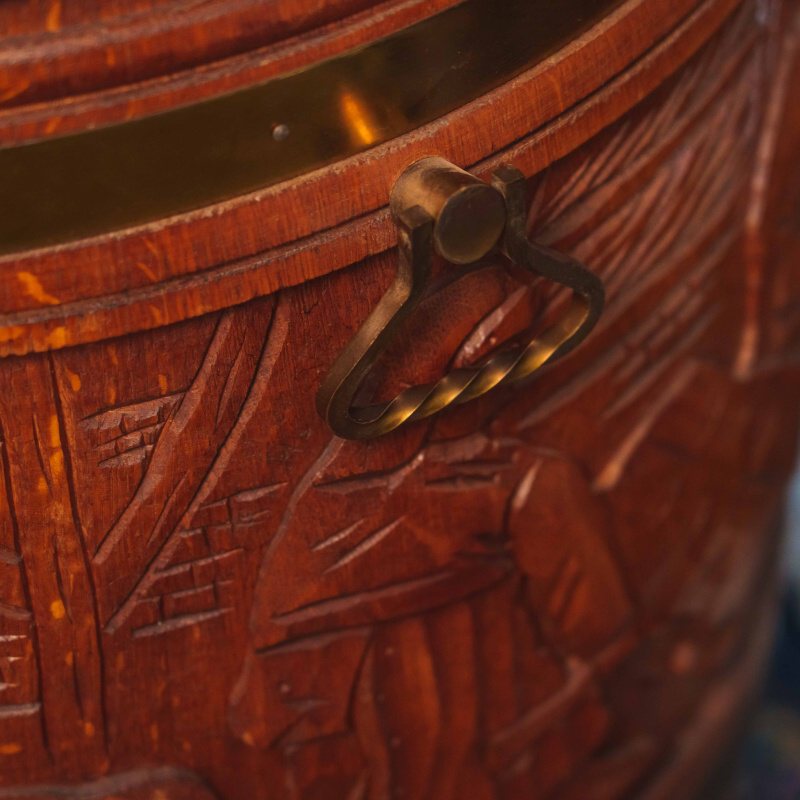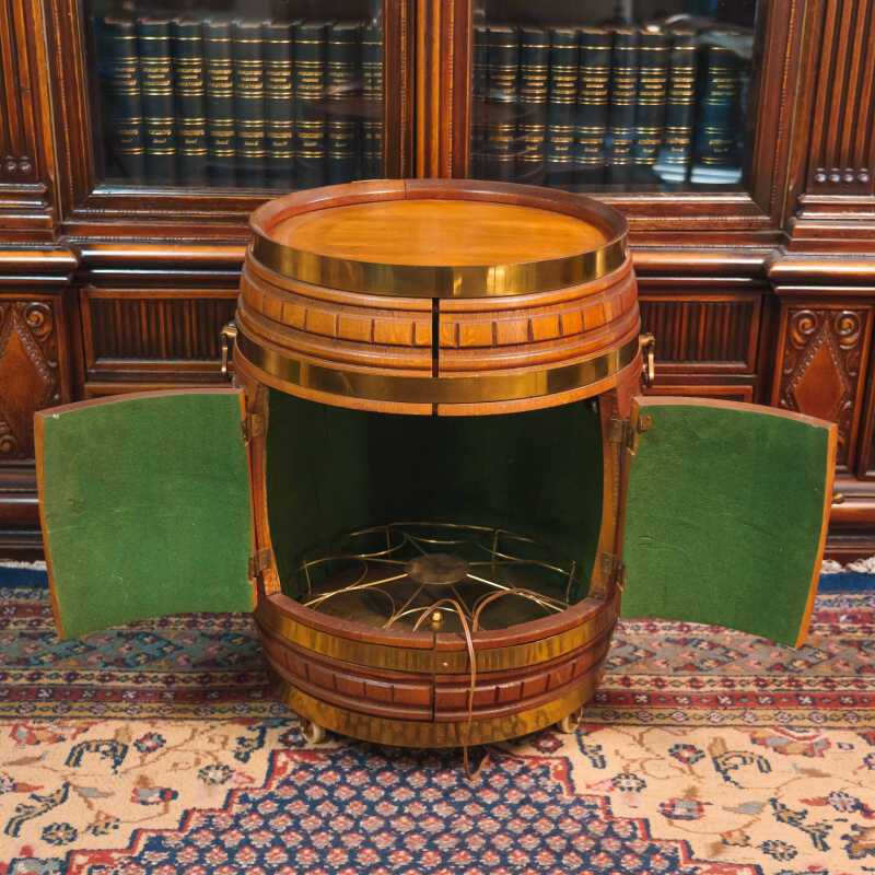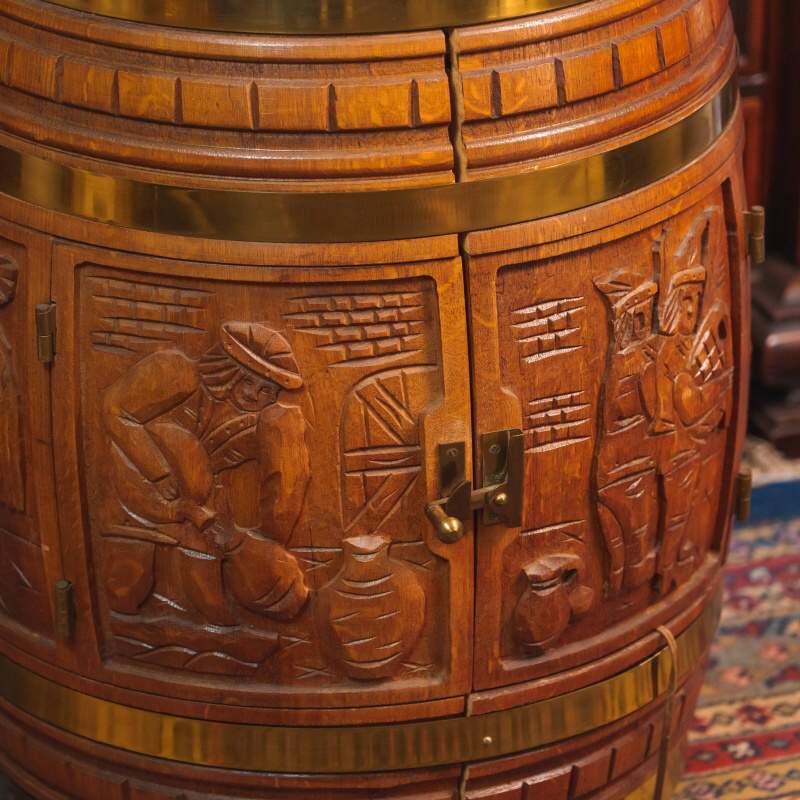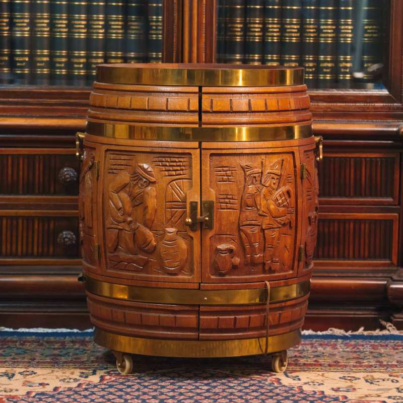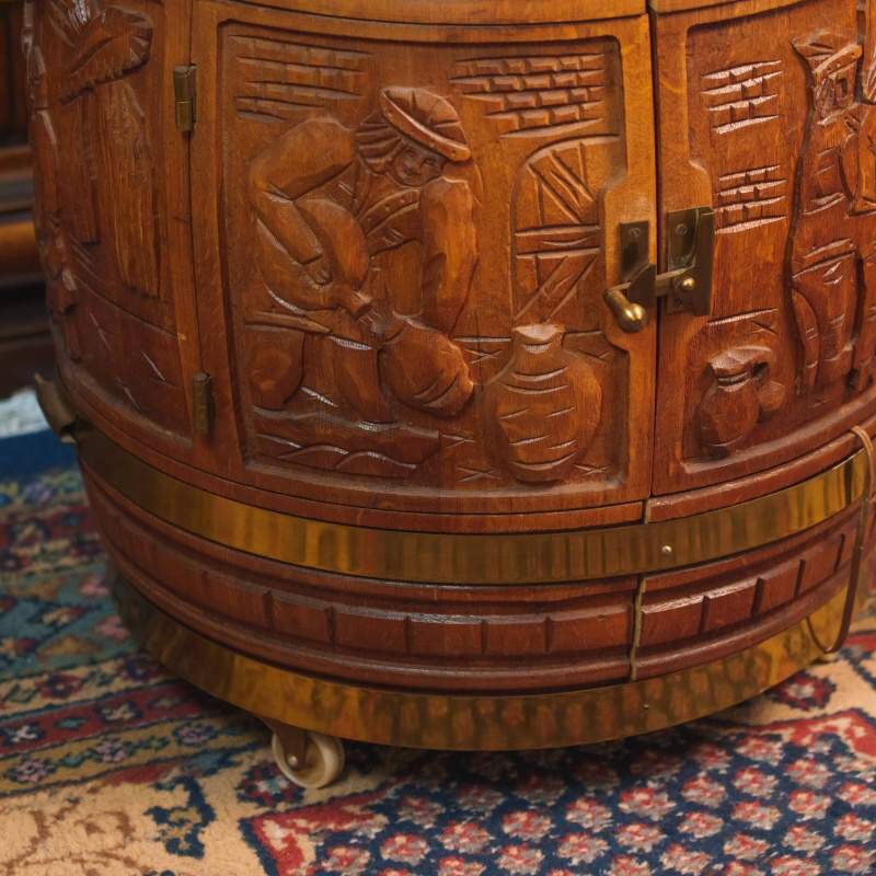 Бар имитирует традиционную винную или пивную бочку, что сразу создает атмосферу старой таверны или закрытого мужского клуба. Компактный и функциональный, он установлен на небольшие поворотные колесики, что позволяло легко перемещать его по залу во время приемов. Корпус выполнен из массива дуба приятного медового оттенка.
