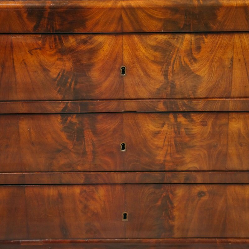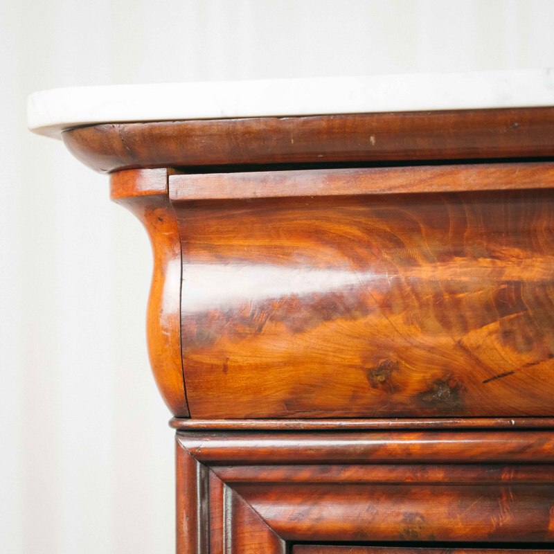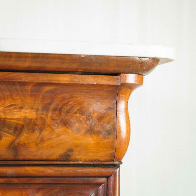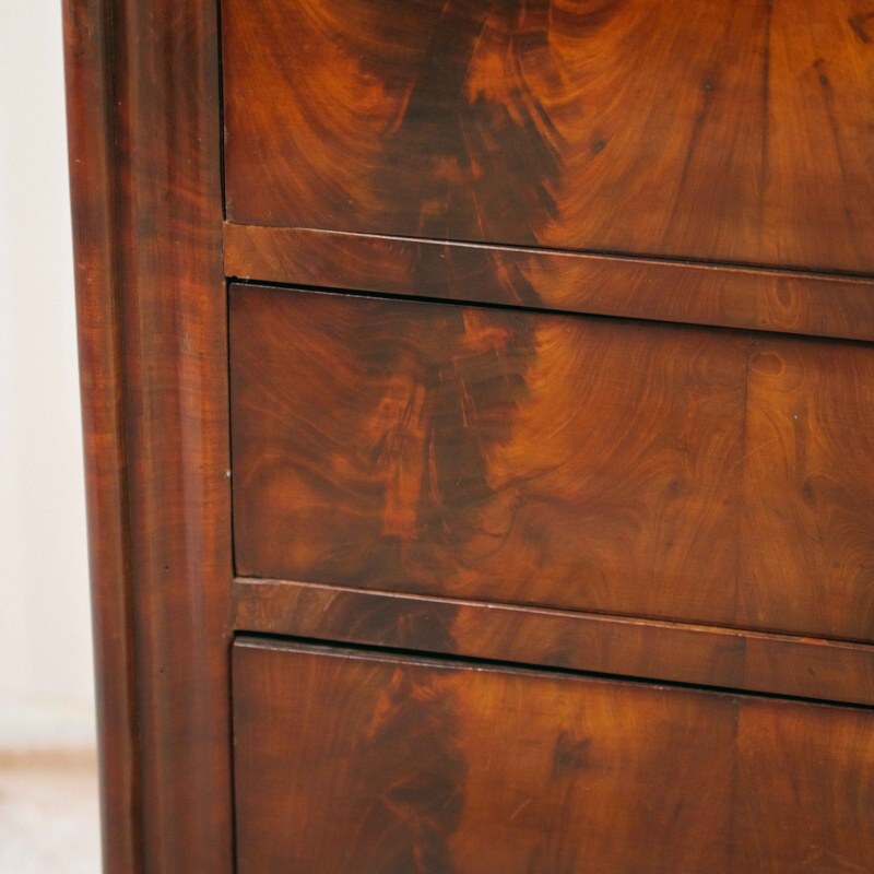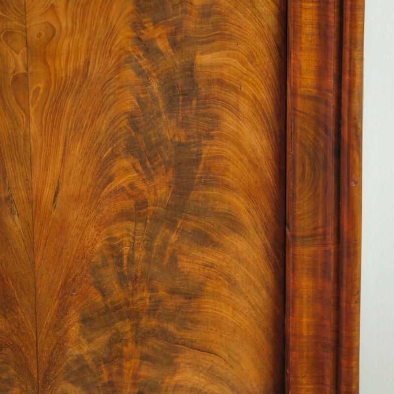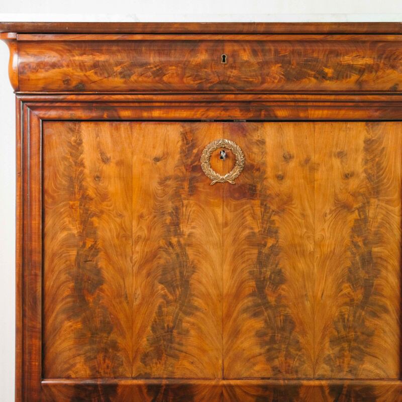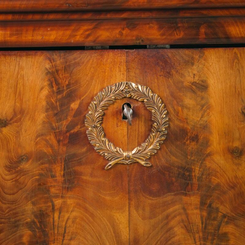 Внутреннее пространство оформлено с особым вниманием к деталям: по бокам размещены по два маленьких ящичка, объединённых в центре ящиком среднего размера. Над ними встроен ещё один горизонтальный ящик, утопленный под верхнюю часть внутреннего «потолка». Нижний край центрального ящика внутри украшен волнообразной резьбой, подчёркивающей утончённый характер отделки. Все элементы подобраны с учётом симметрии и сбалансированности композиции, что делает этот секретер не только функциональной, но и выразительно декоративной частью интерьера