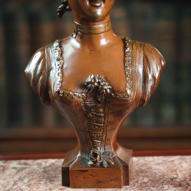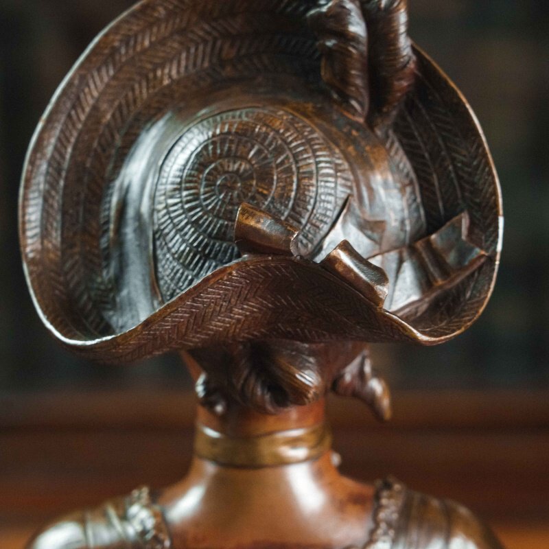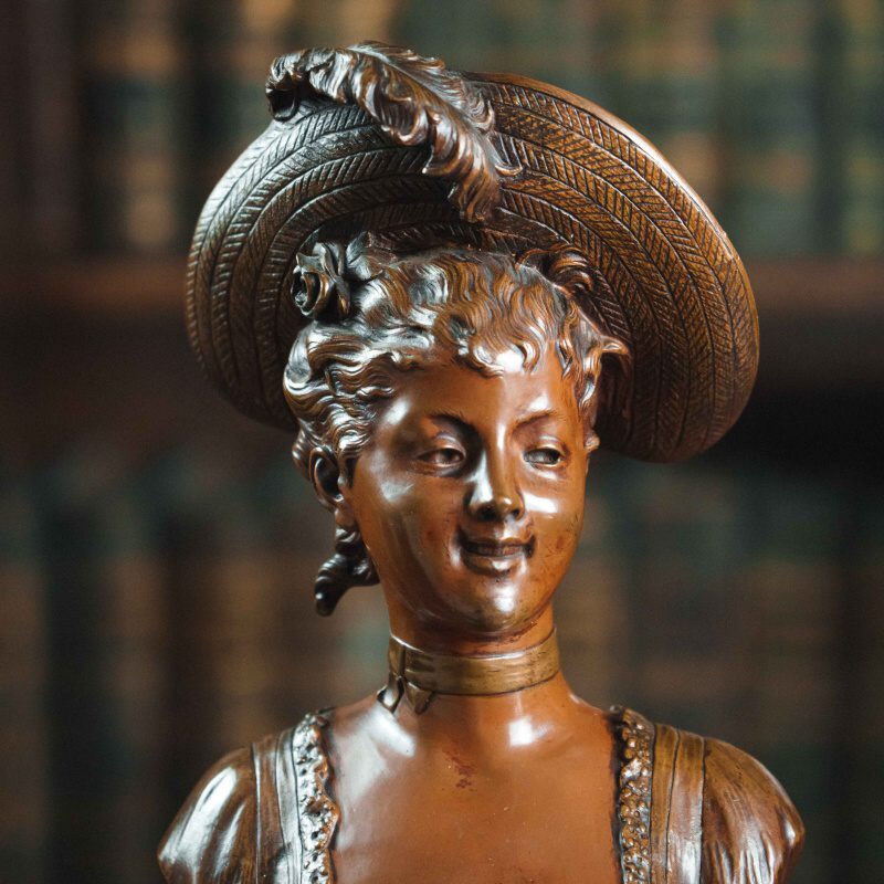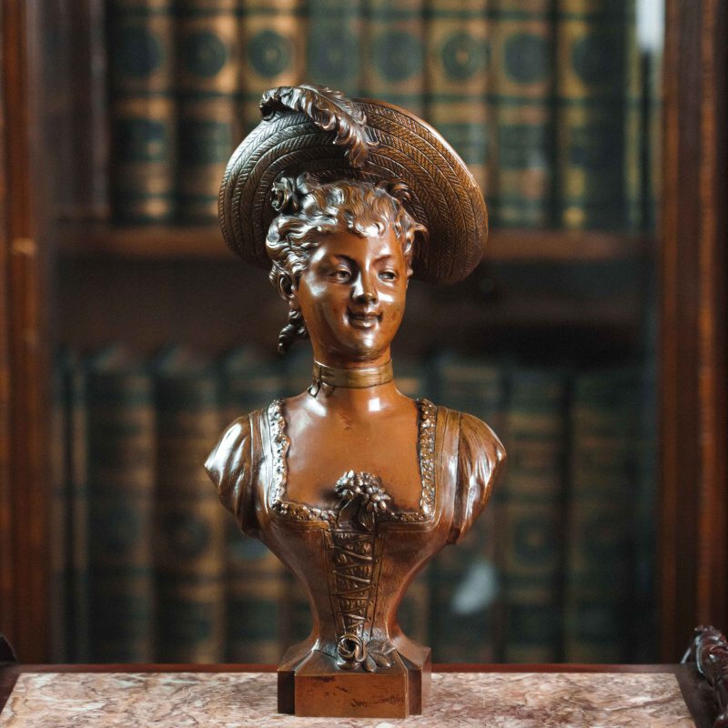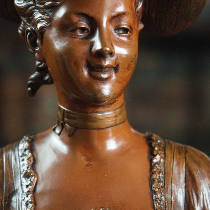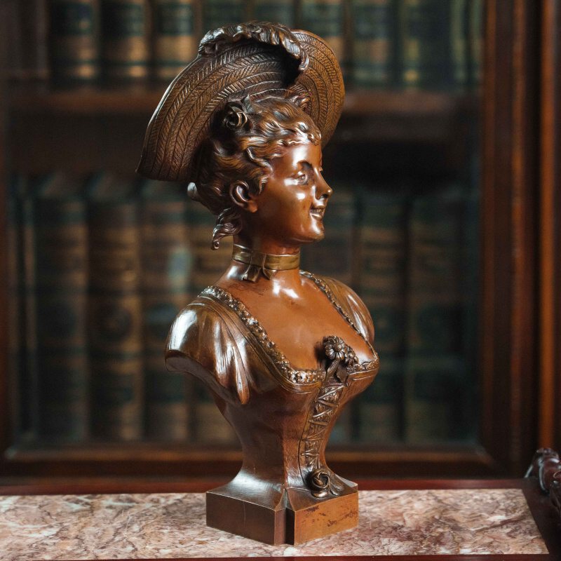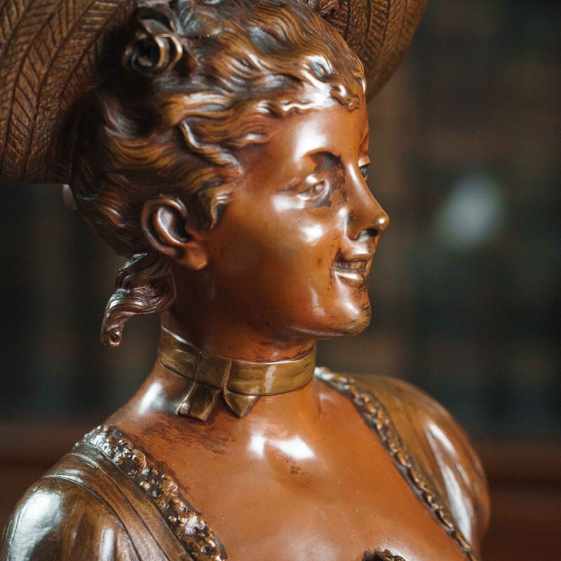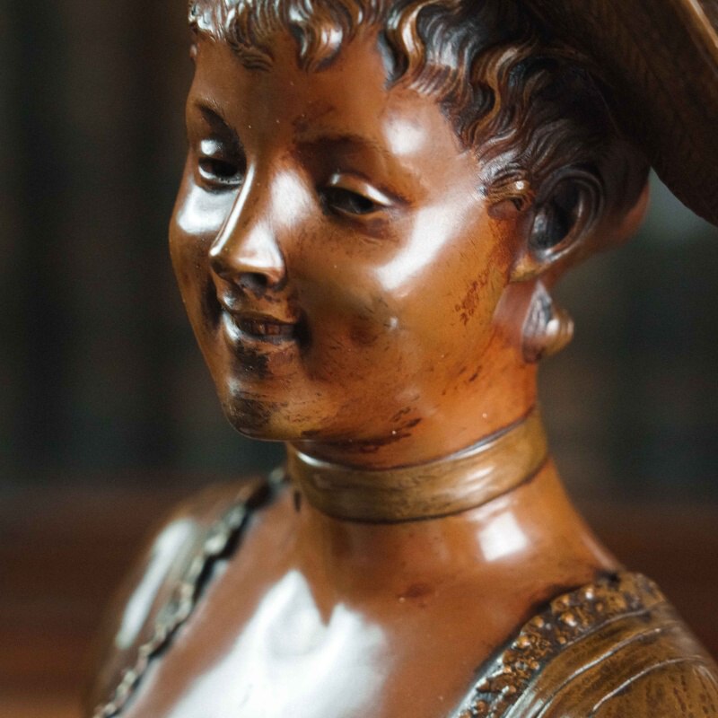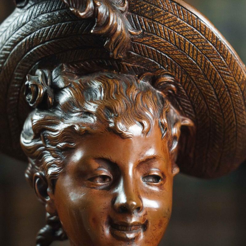 Скульптура изображает молодую девушку с кокетливой улыбкой, одетую в платье с глубоким квадратным вырезом и шнурованным корсажем, декорированным мелкими цветами. На шее выделяется тонкий чокер, подчёркивающий изящество образа. Особое очарование придаёт широкополая шляпа, украшенная пышным пером, выполненным с тщательной проработкой фактуры. Скульптор сумел передать мягкость черт лица, блеск улыбки и лёгкую театральность позы, что сближает работу с эстетикой декоративного жанра конца XIX века. На основании бюста присутствует подпись ROUSSEAU, подтверждающая авторство.