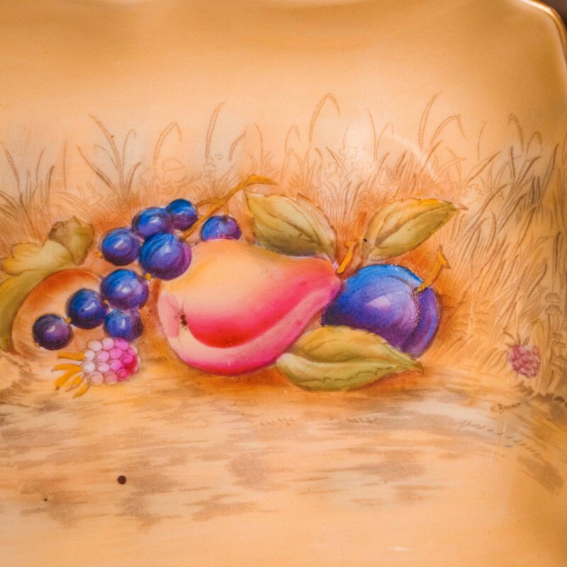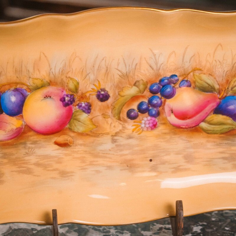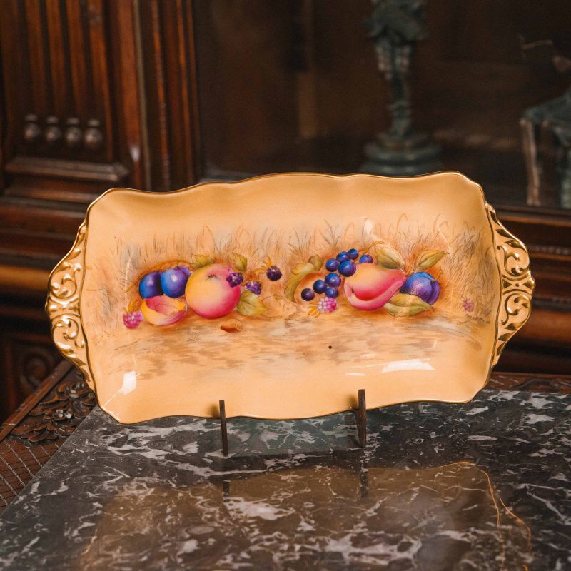 Изящное прямоугольное блюдо из костяного фарфора Aynsley (Англия), украшенное фирменной ручной росписью фруктов в тёплой пастельной гамме.
