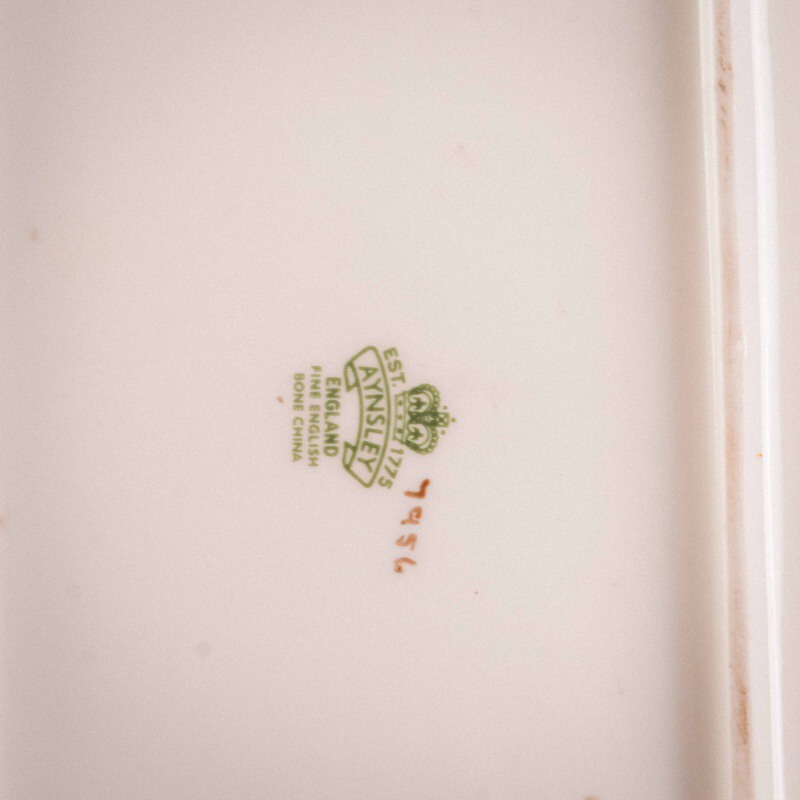 Края блюда оформлены богатыми золочёными завитками, характерными для декоративных изделий Aynsley середины XX века.