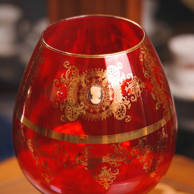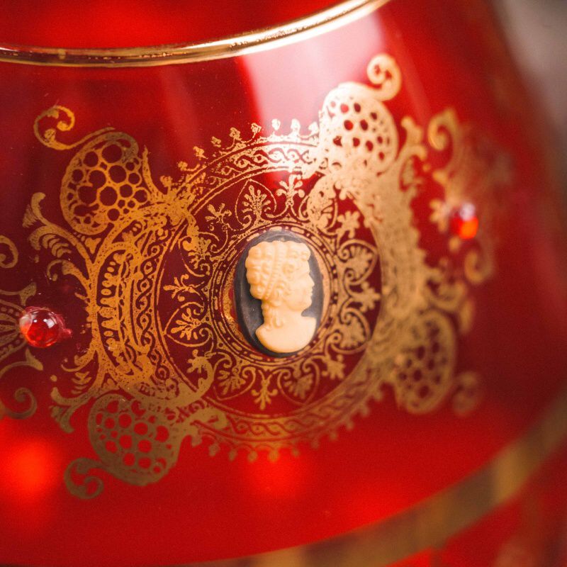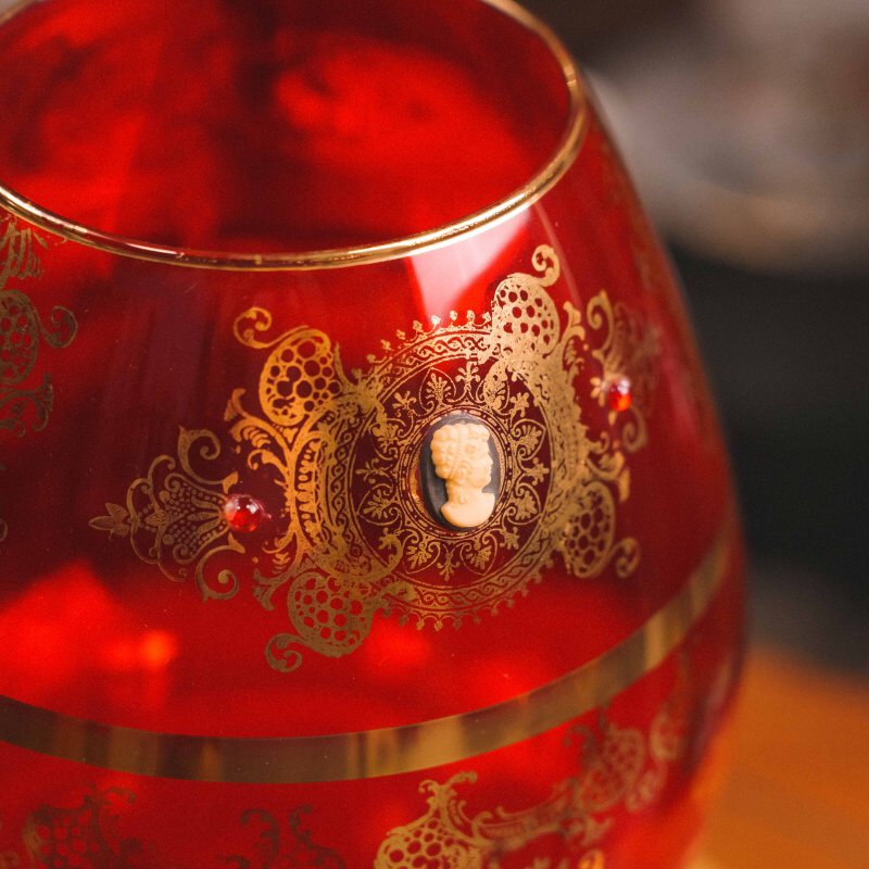 Эффектный декоративный бокал выполнен из насыщенного рубиново-красного стекла, оттенок которого усиливается мягкими бликами света. Поверхность украшена широкими орнаментальными золотыми поясами, в узорах которых читаются мотивы барочного кружева, стилизованные картуши и растительные завитки. В центре одного из картушей помещена миниатюрная овальная камея с женским профилем в античном стиле — акцент, придающий предмету особую изысканность и отсылающий к традициям европейского декоративного искусства XIX века. Композицию дополняют небольшие накладные стеклянные элементы тёплого рубинового цвета, которые создают эффект драгоценных вставок.