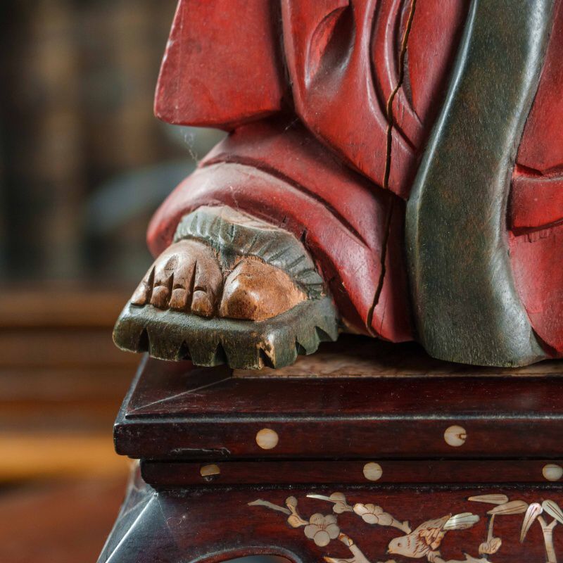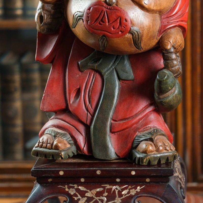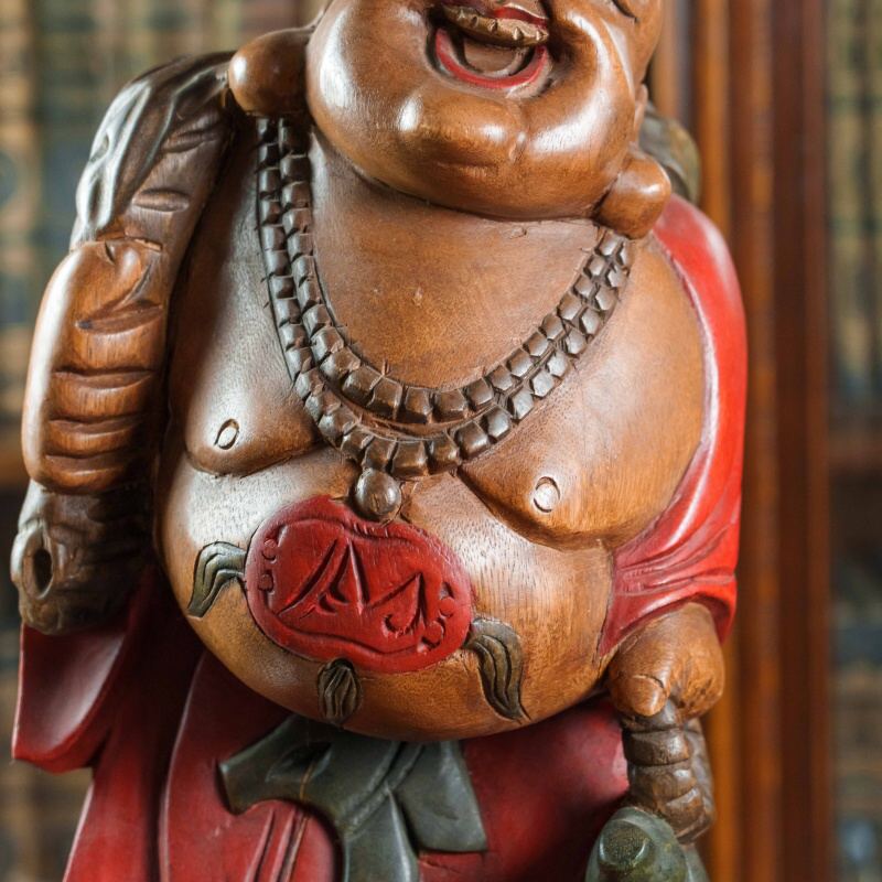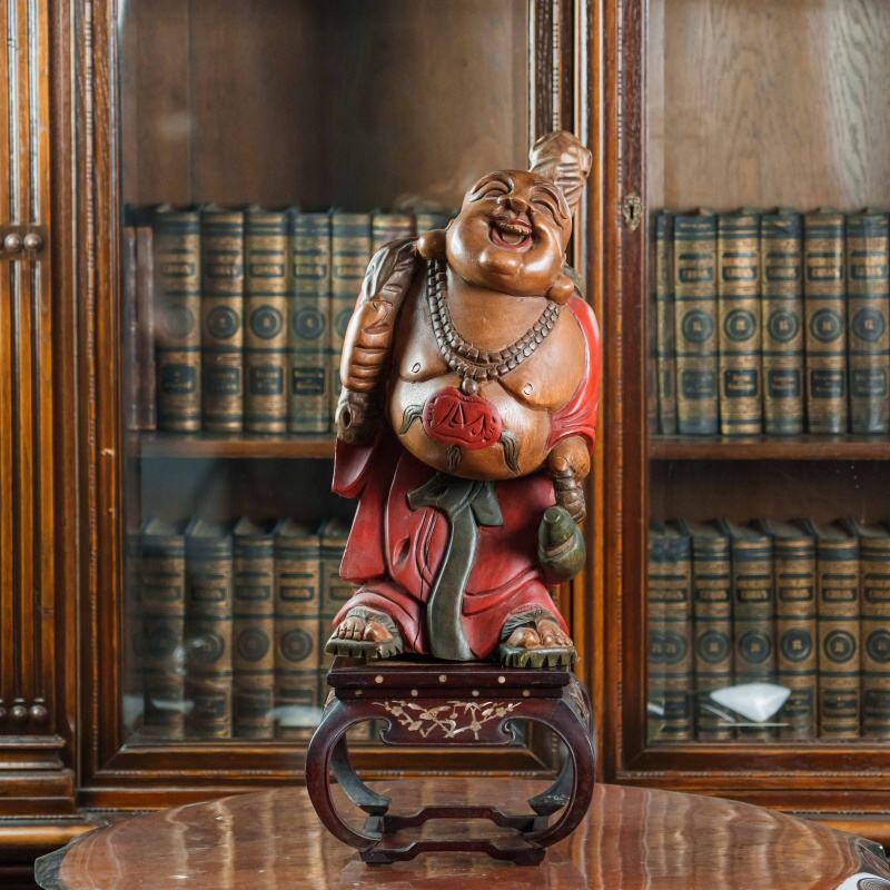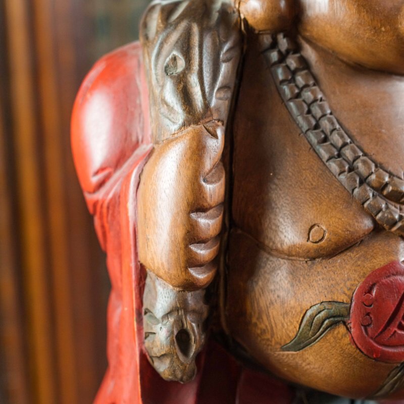Красочная статуэтка смеющегося Будды, также известного как Хотэй, выполненная из дерева с элементами росписи. Фигура Будды, излучающая радость и благополучие, изображена в красных одеждах, украшенных золотистыми акцентами и ожерельем с крупными бусинами. На животе Будды виден красный символ, а в руке он держит мешок, символизирующий богатство и удачу.