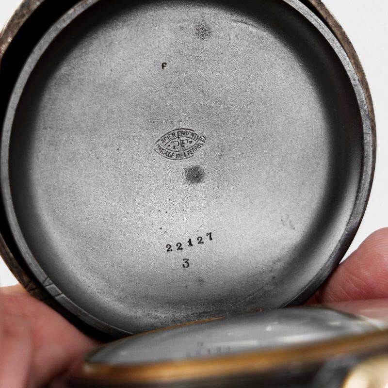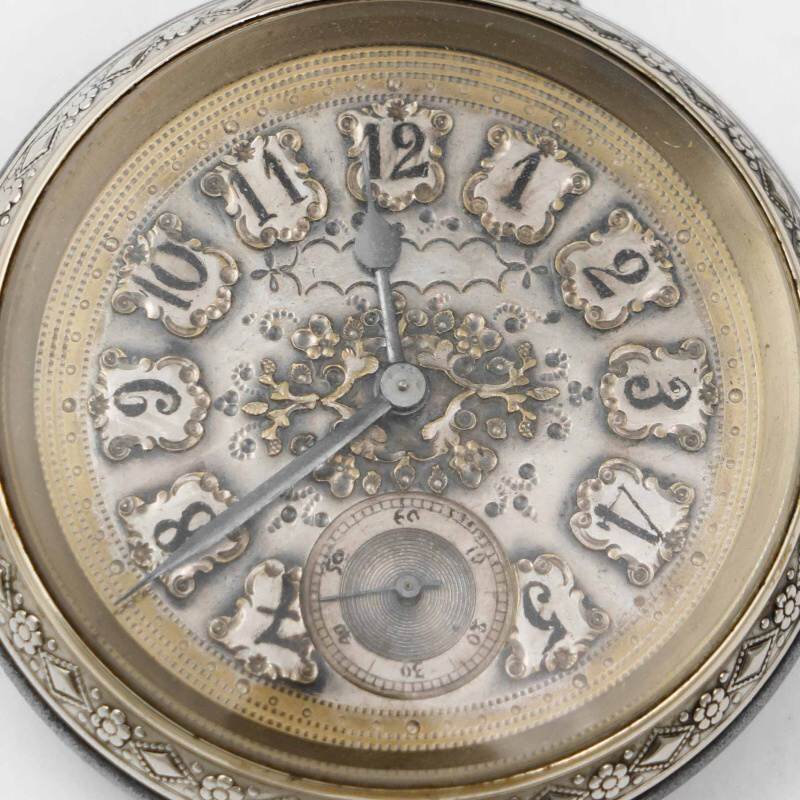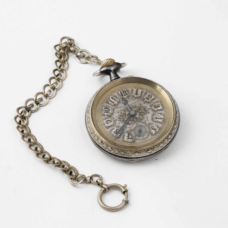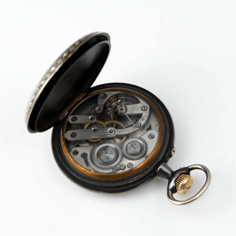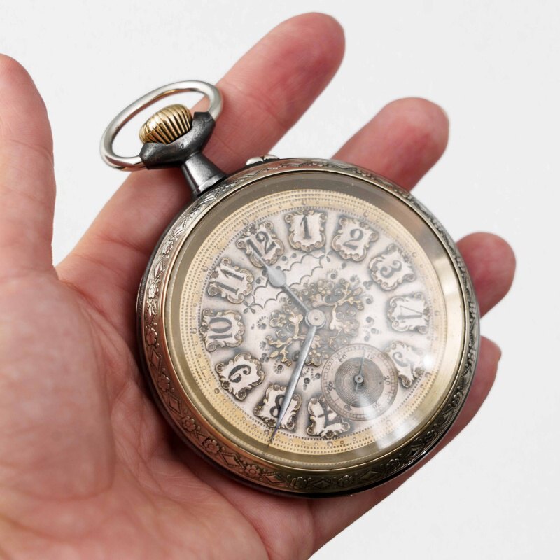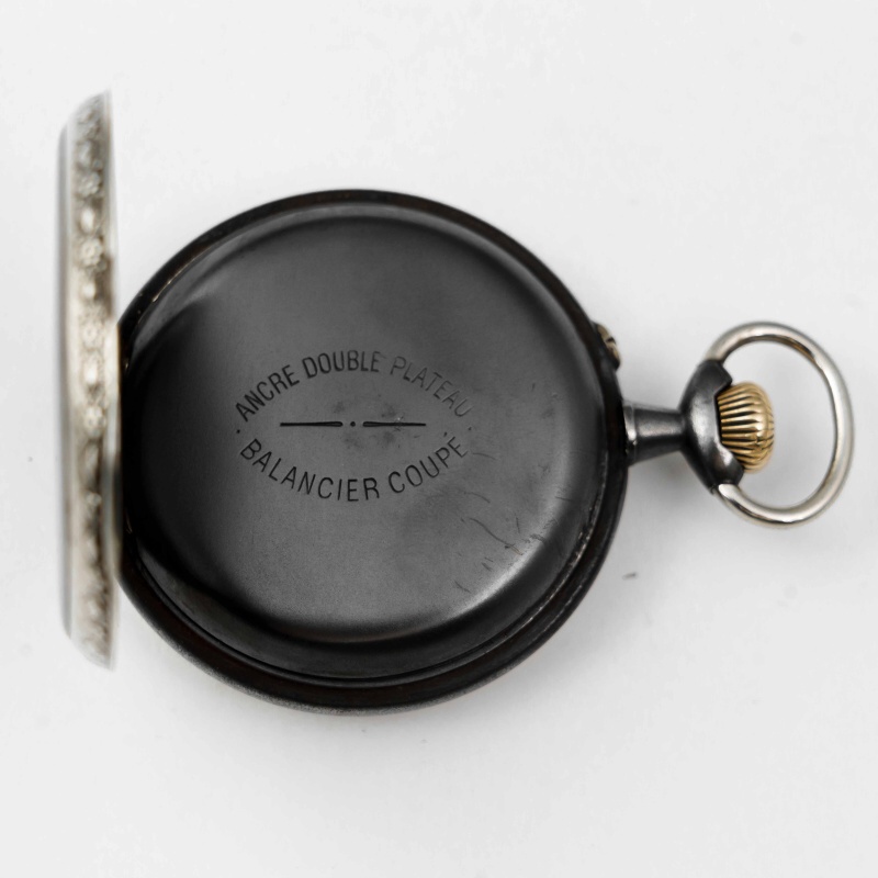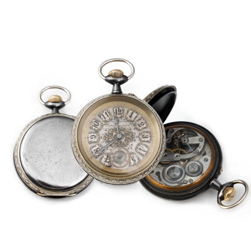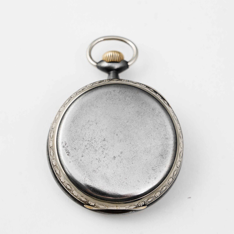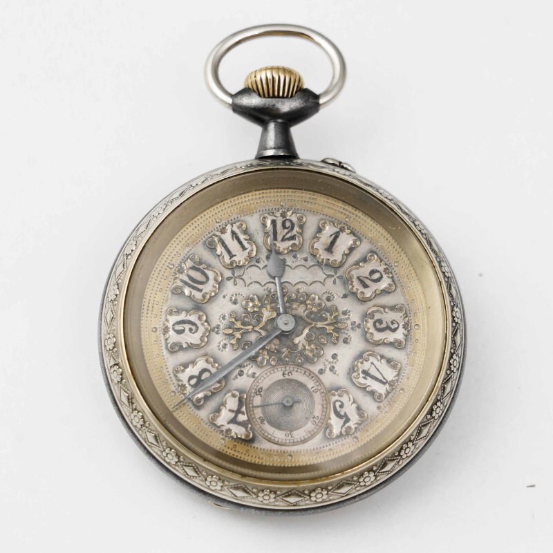 Старинные карманные часы, в корпусе из вороненной стали, никелированный ободок, с красивым классическим узором. Корпус не поврежден, крышки работают исправно. Красивый серебристый циферблат украшенный орнаментом, большие выделенные арабские цифры и черненные стрелки. Малая секундная стрелка в положении «6 часов». Завод — заводной головкой (Коронкой), кнопка перевода стрелок расположена с боку от заводной головки. Красивый никелированный анкерный механизм.