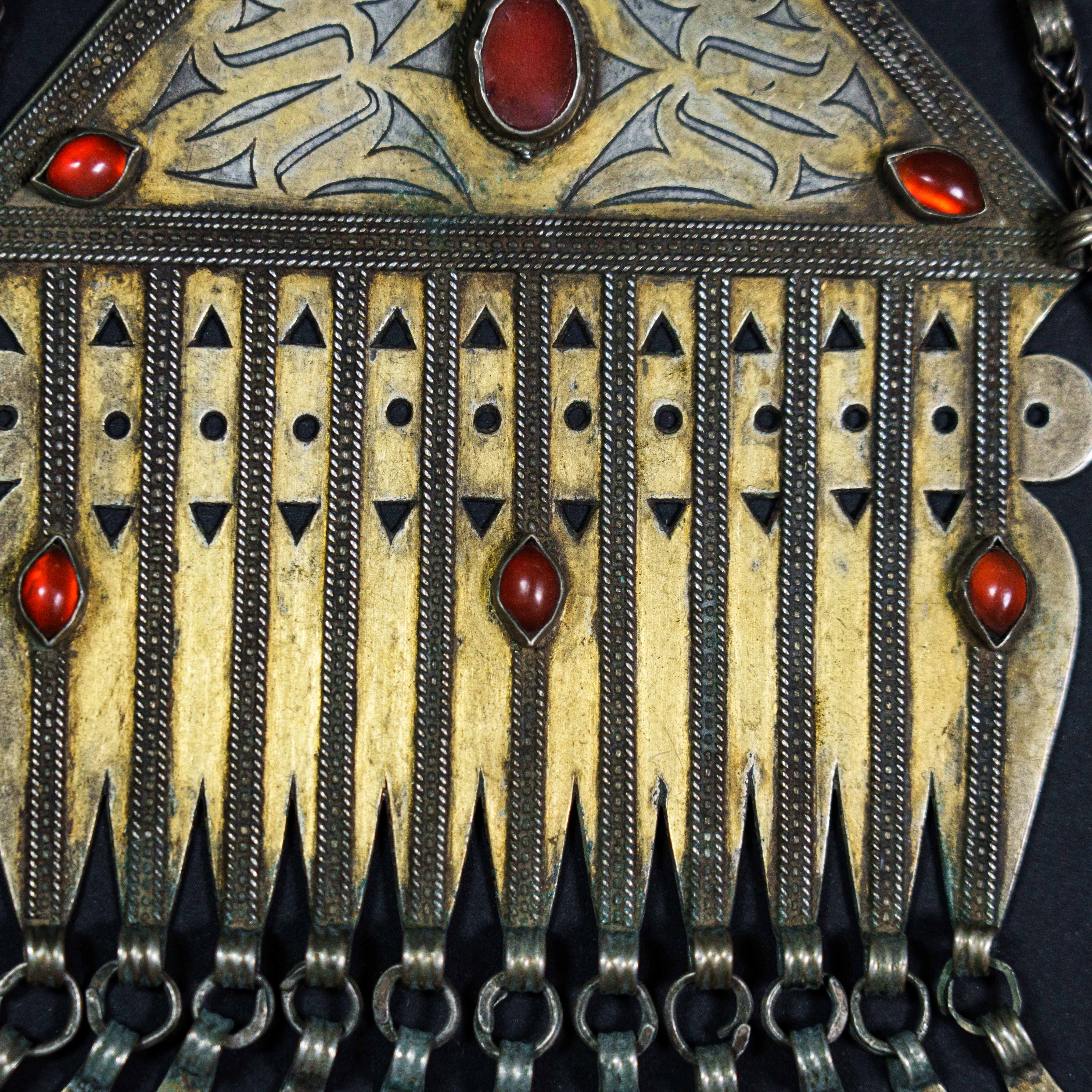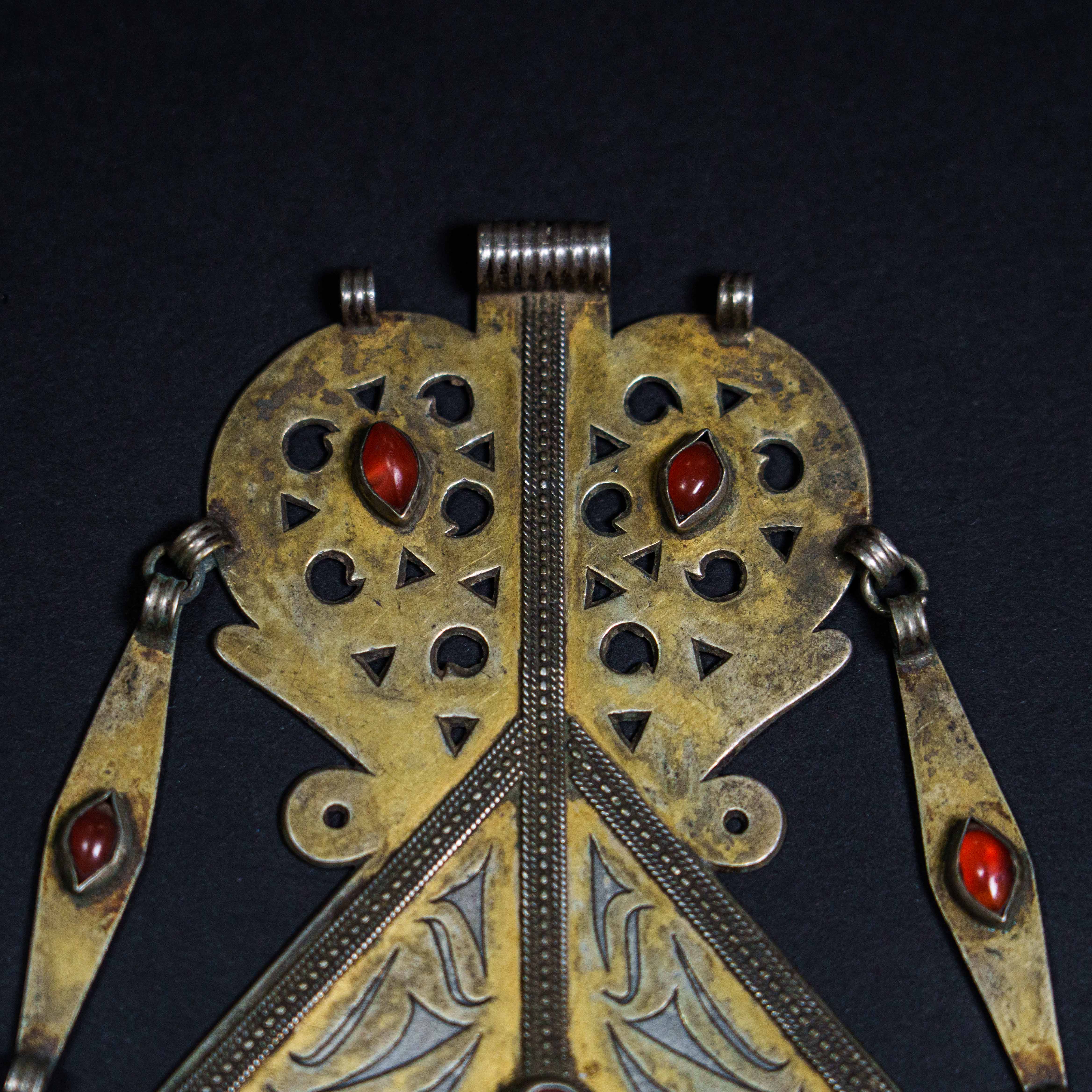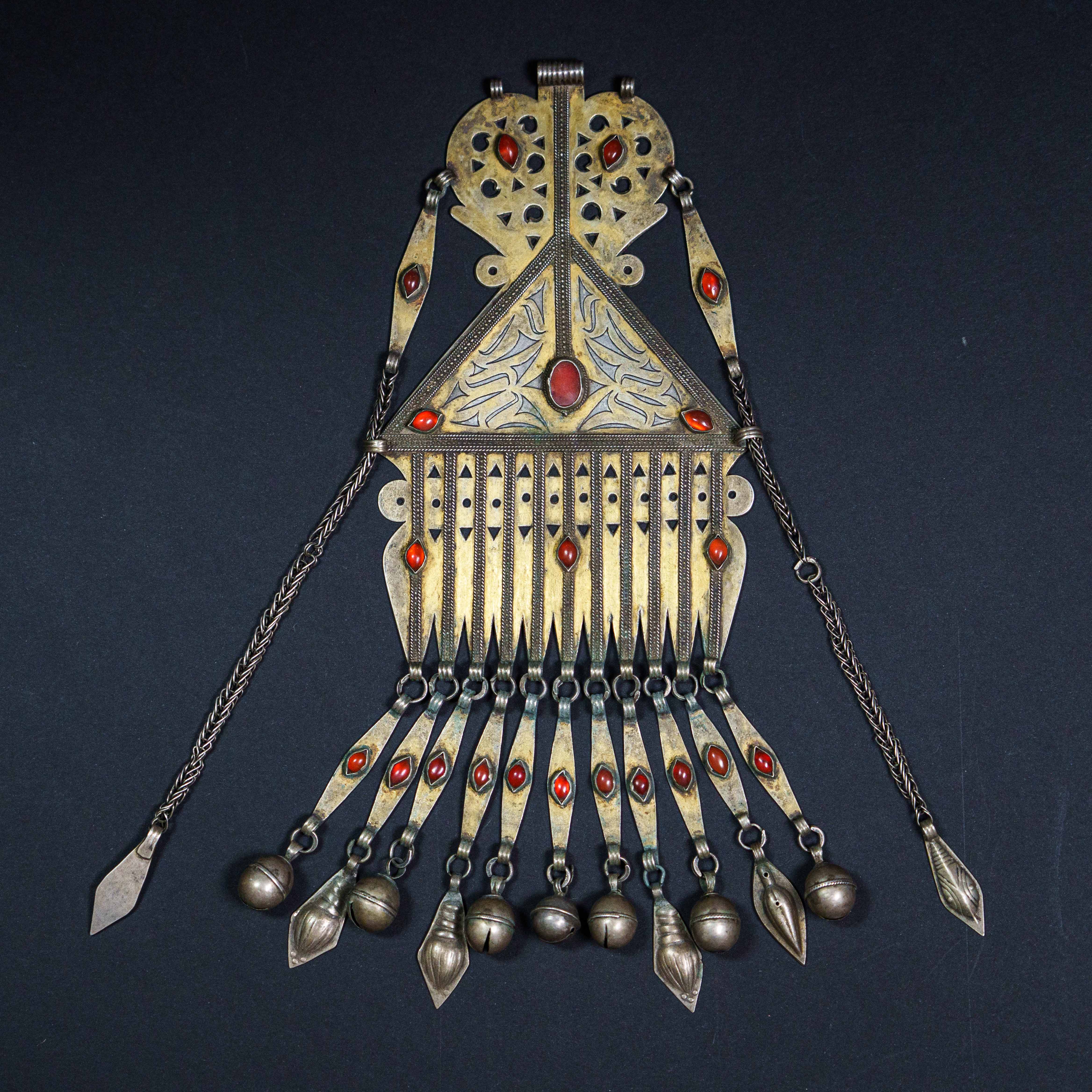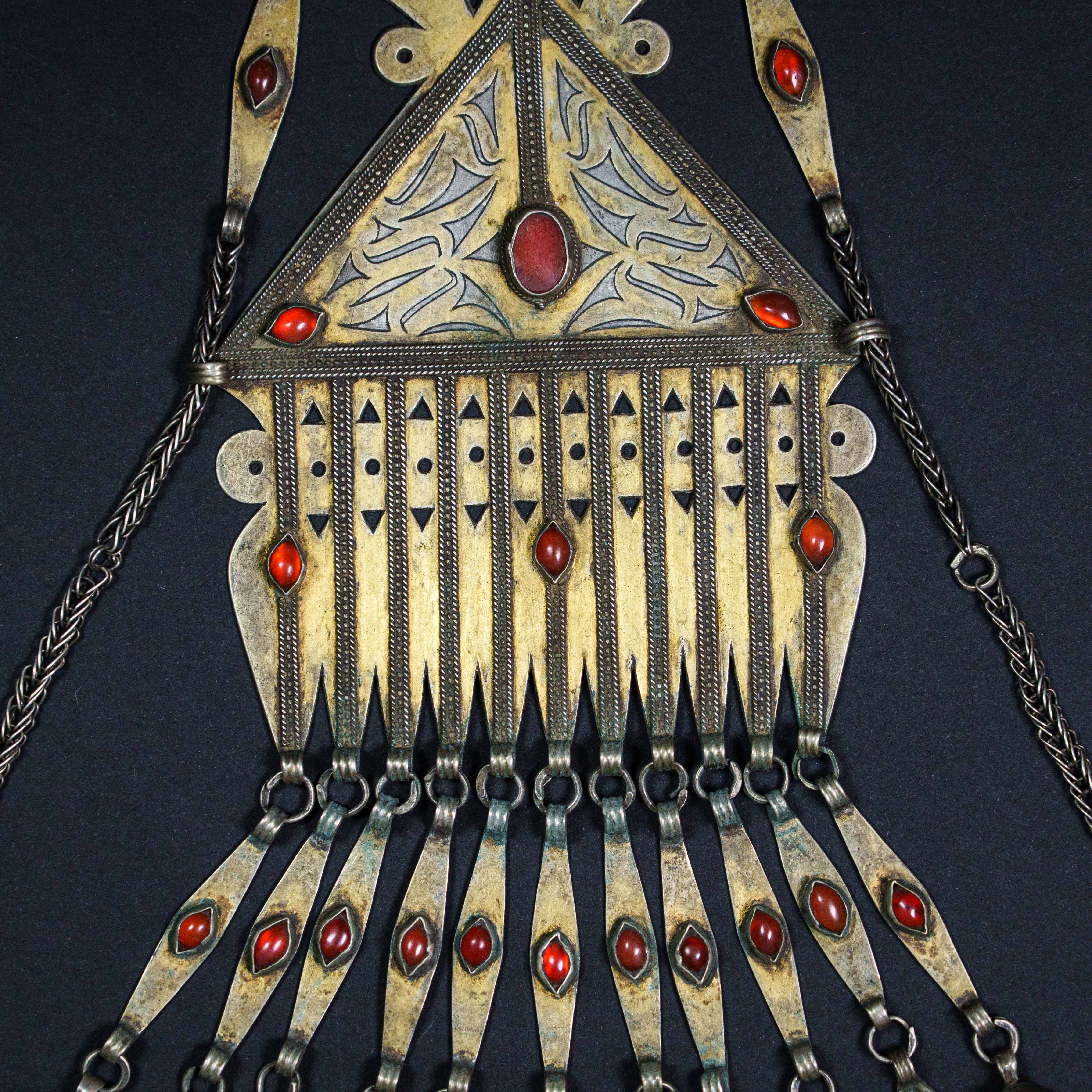 Большой туркменский кулон «Енселик» имеет необычный вид, колокольчика с фестончатым краем, сквозным прорезным узором в виде сердечек и стреловидных фигур, множества и камней, мягкий блеск которых оттенялся позолоченным геометризованным растительным орнаментом.
