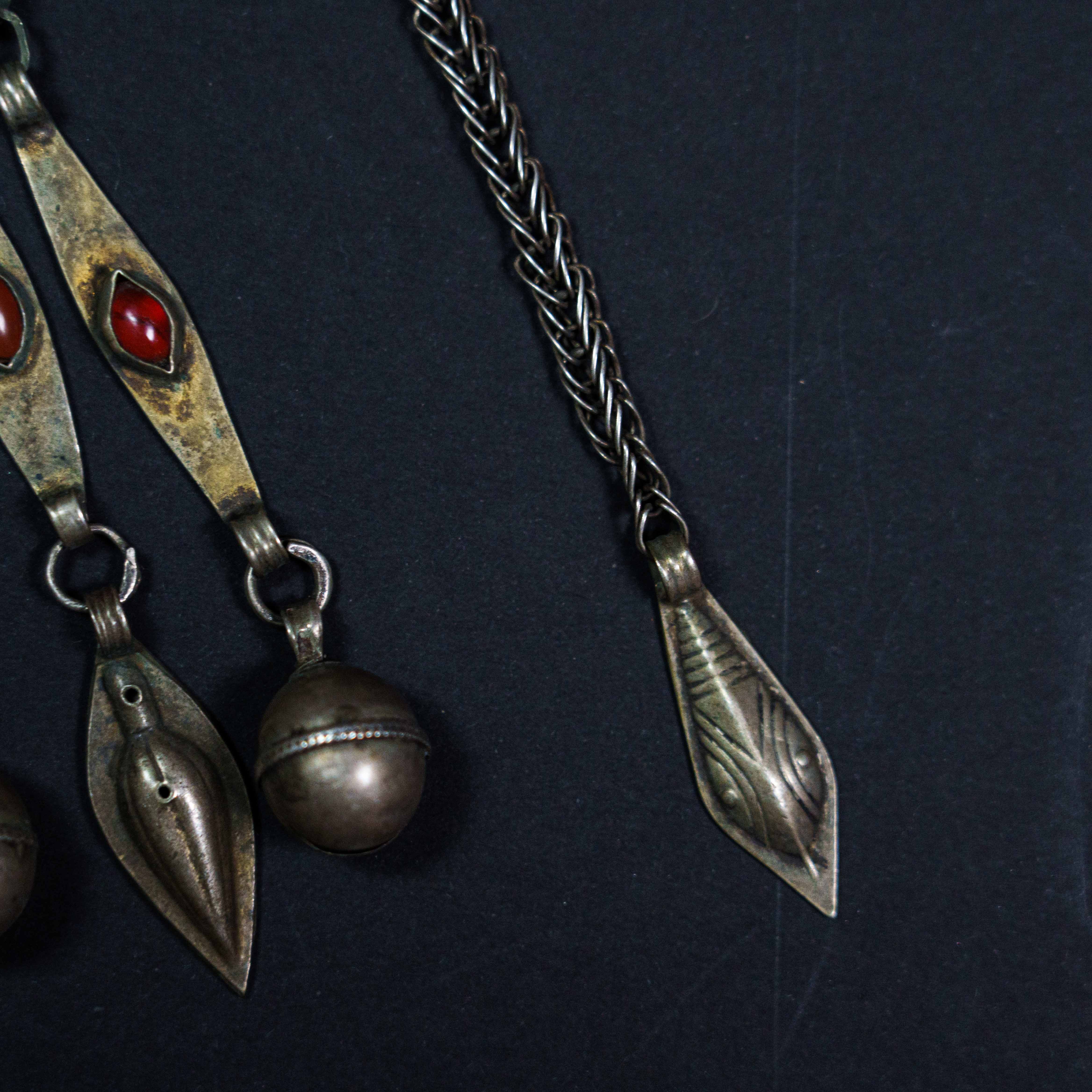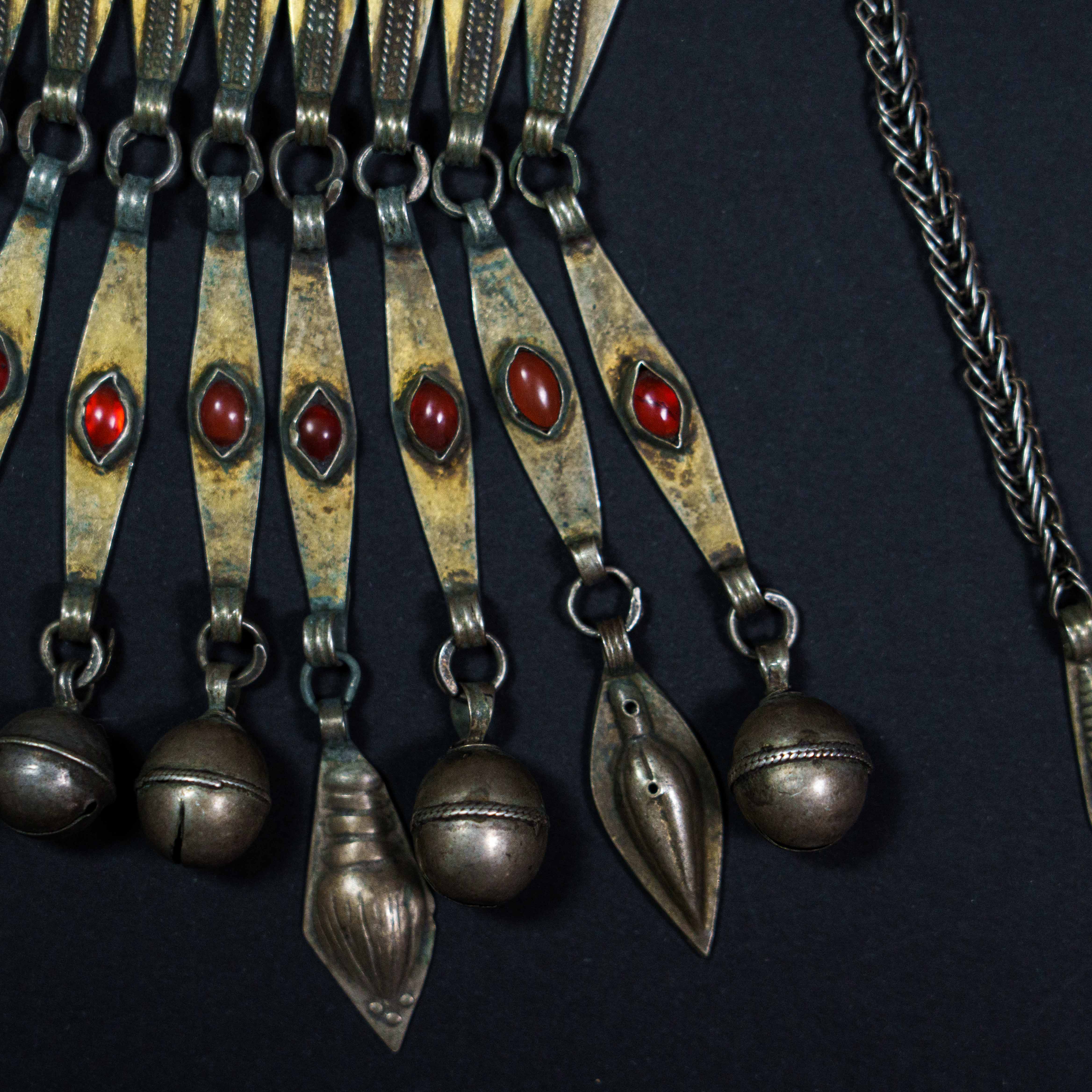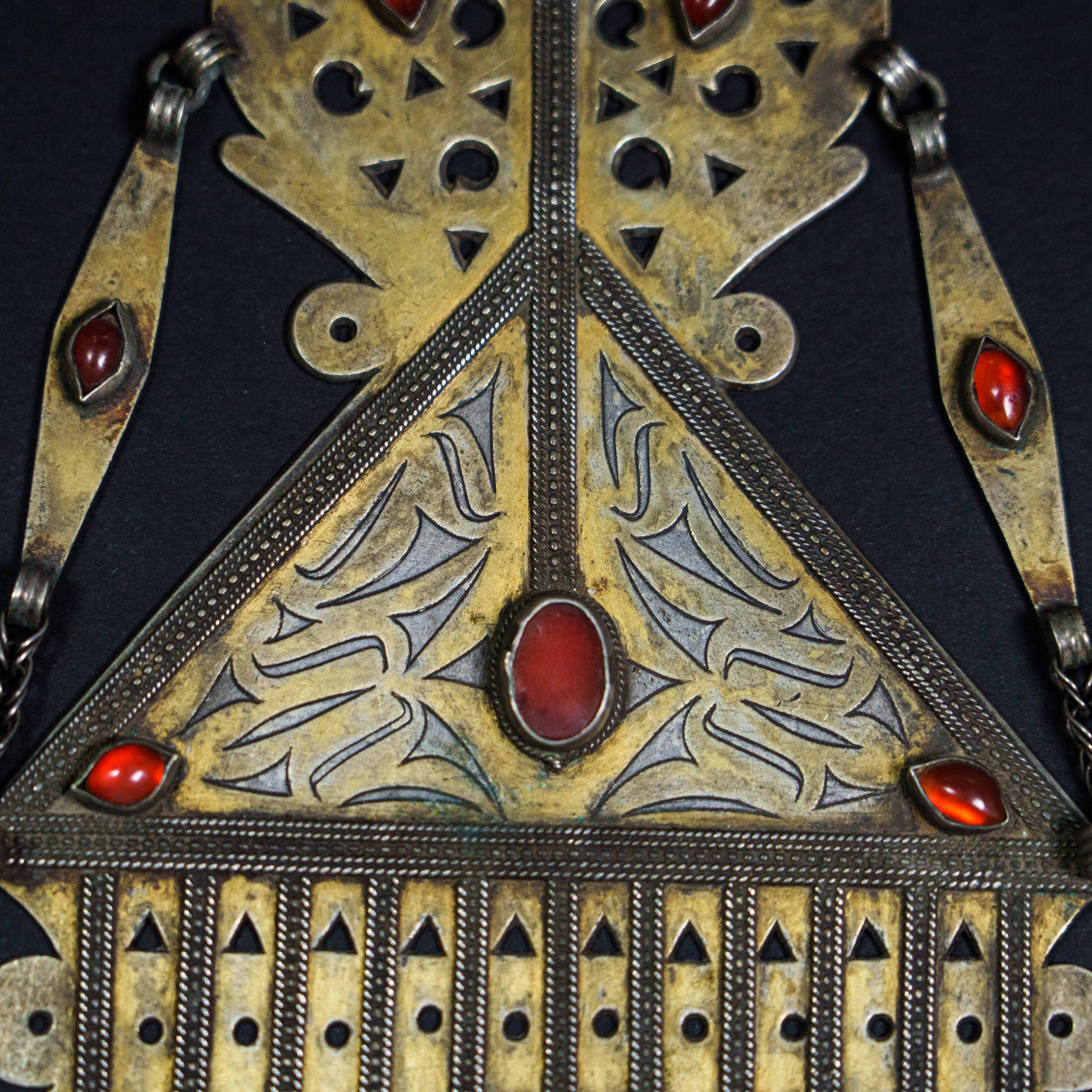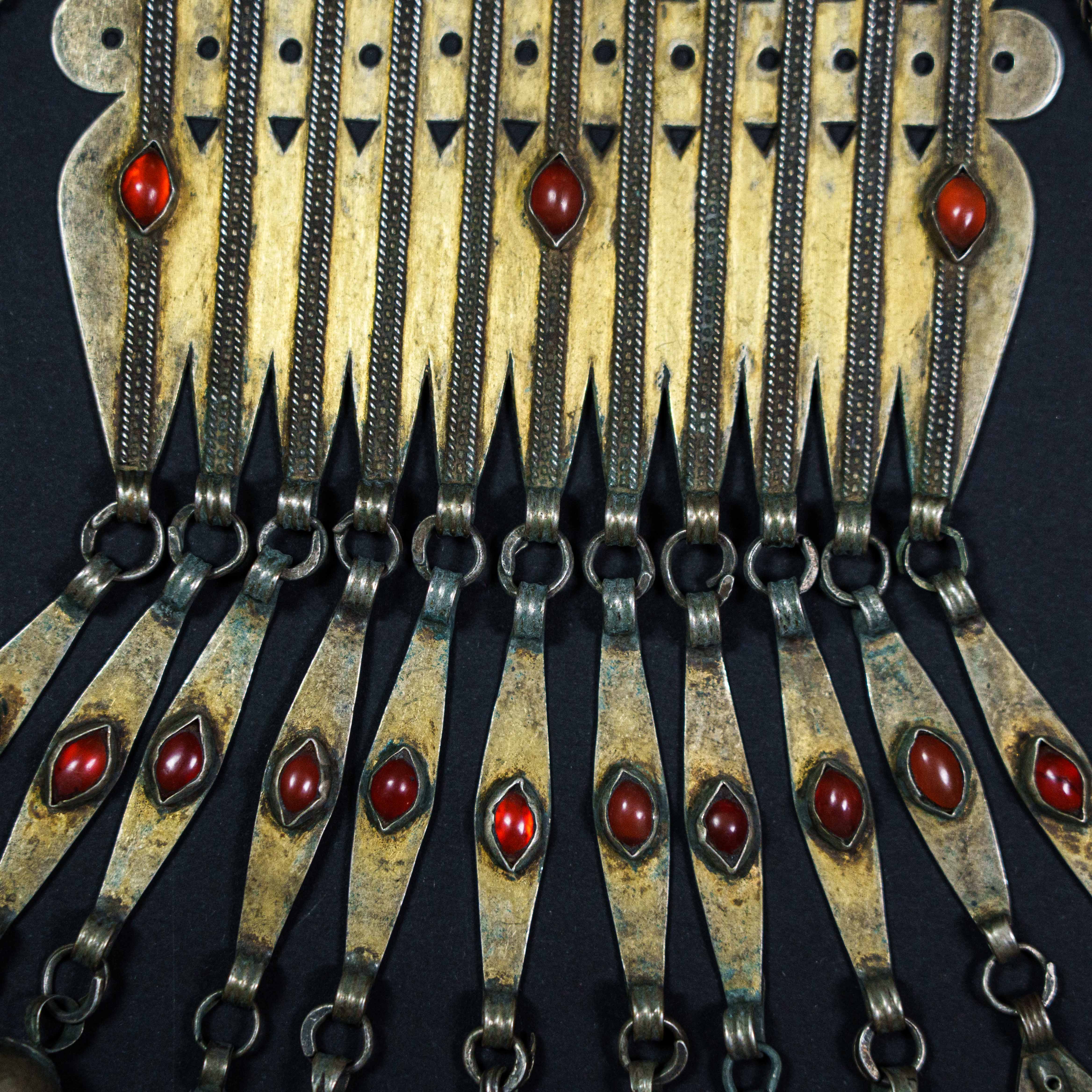 Большой туркменский кулон «Енселик» имеет необычный вид, колокольчика с фестончатым краем, сквозным прорезным узором в виде сердечек и стреловидных фигур, множества и камней, мягкий блеск которых оттенялся позолоченным геометризованным растительным орнаментом.