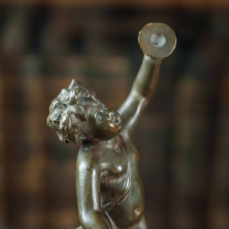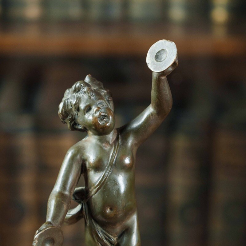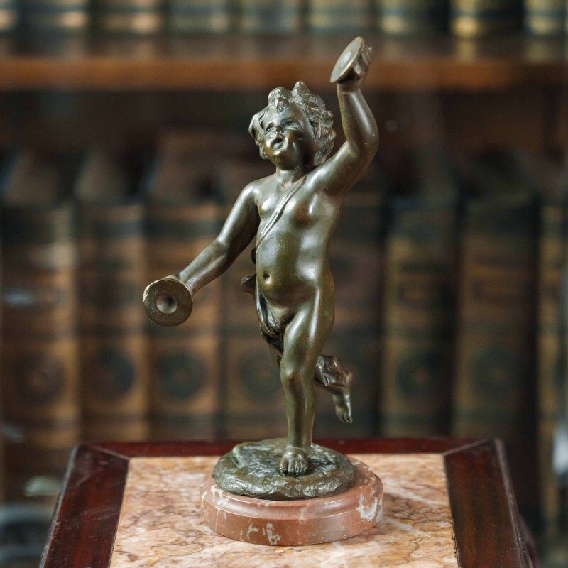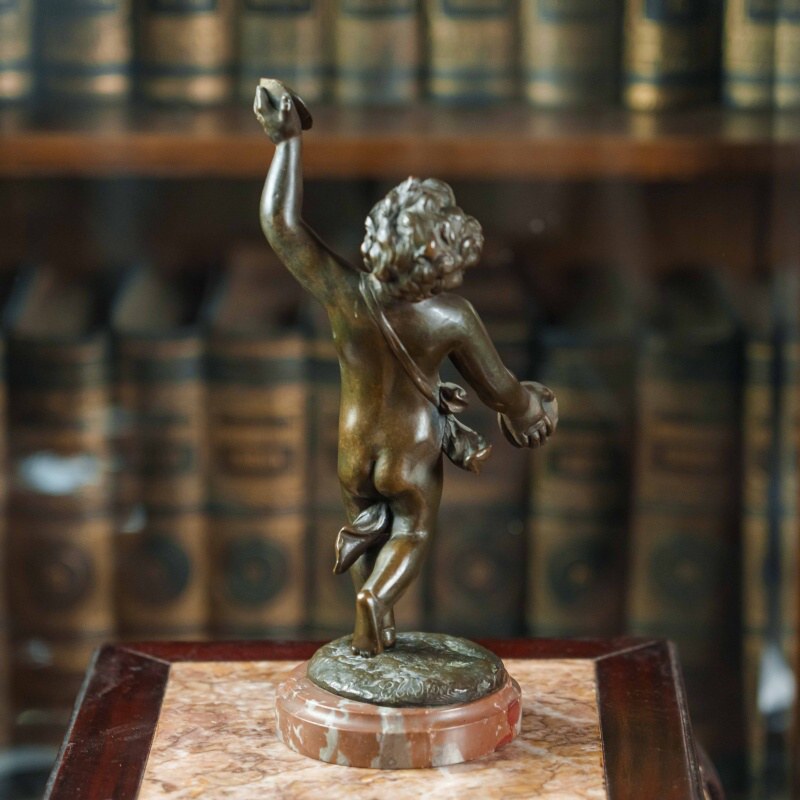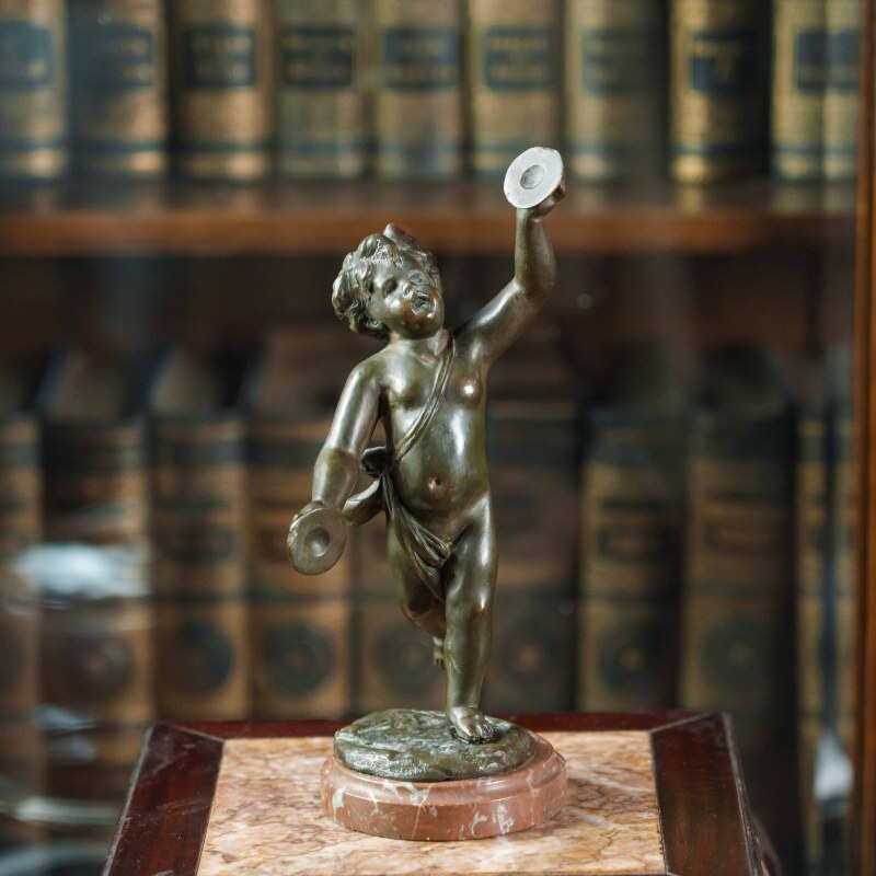 Изящная бронзовая скульптура изображает юного амура, радостно танцующего и играющего на цимбалах в руках. Его лёгкая поза, мягкие очертания тела и живая мимика передают ту грациозную игривость, которой славились произведения Клодиона — одного из крупнейших мастеров французского рококо.