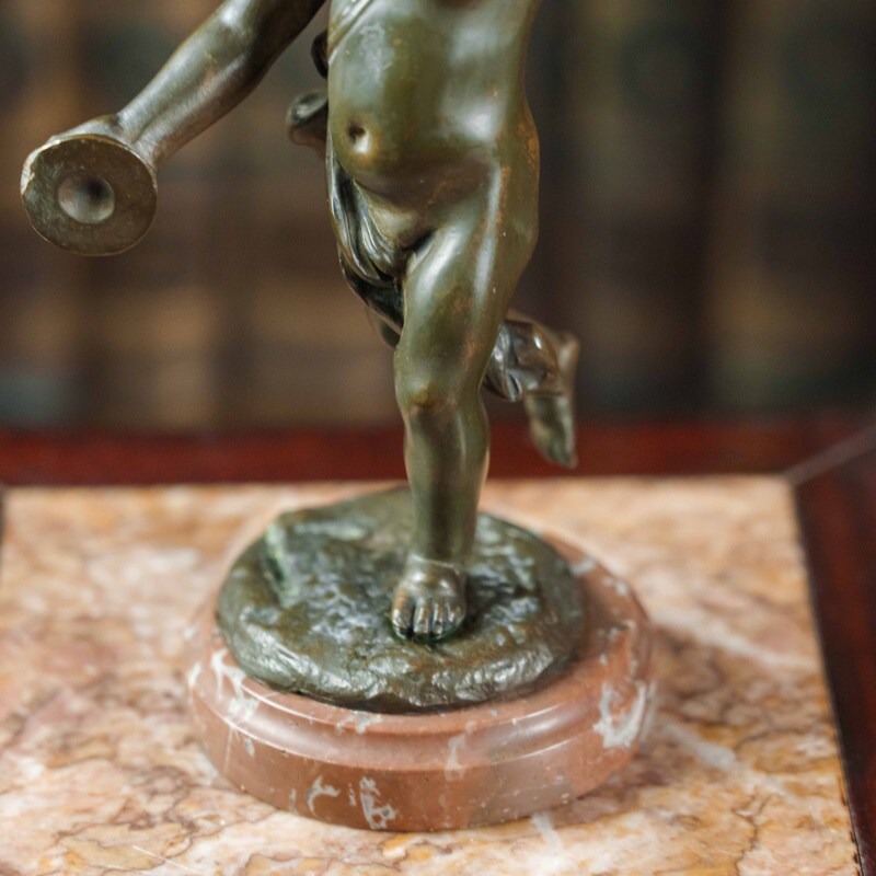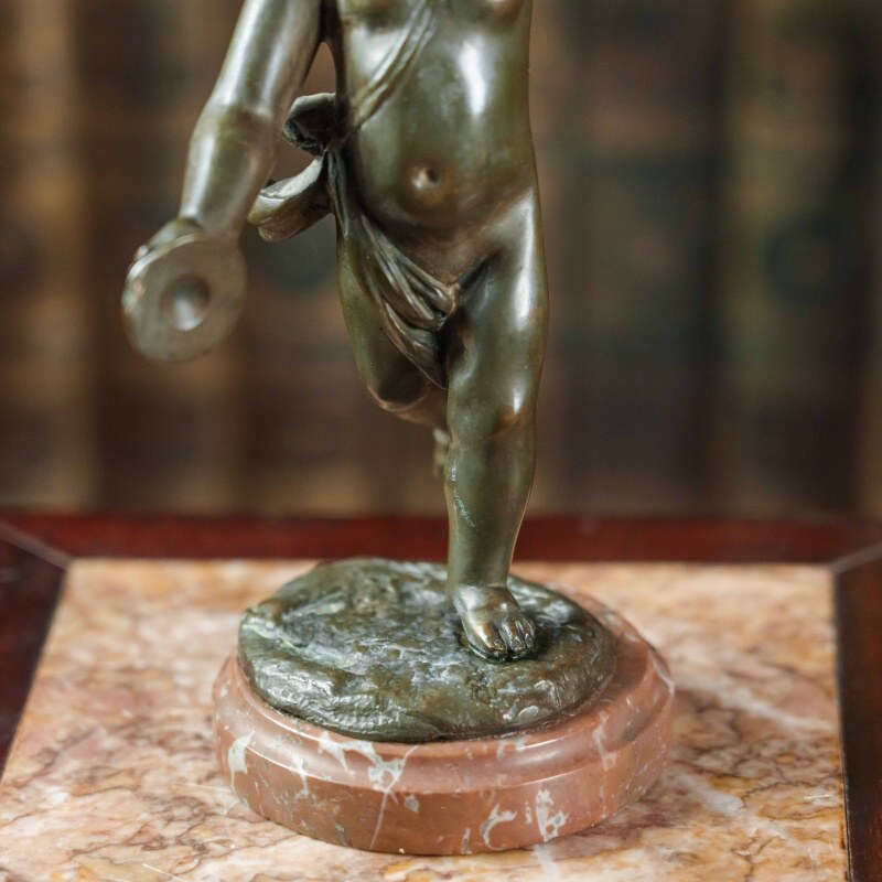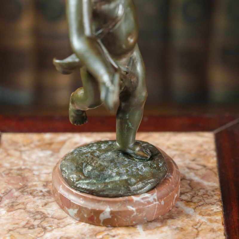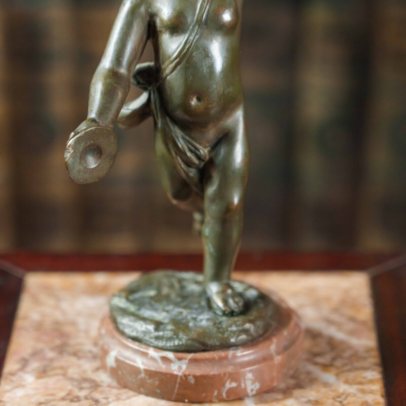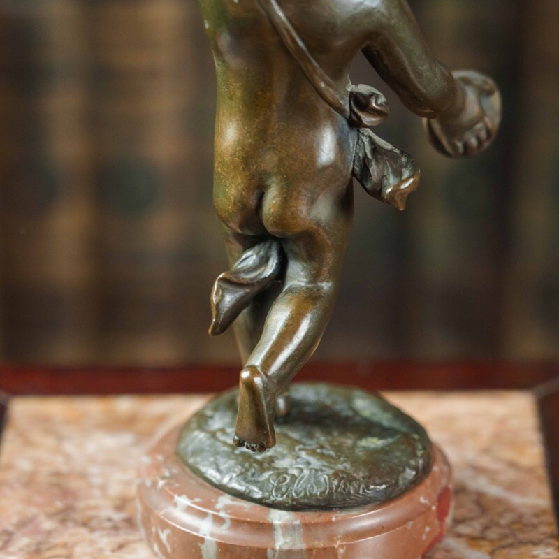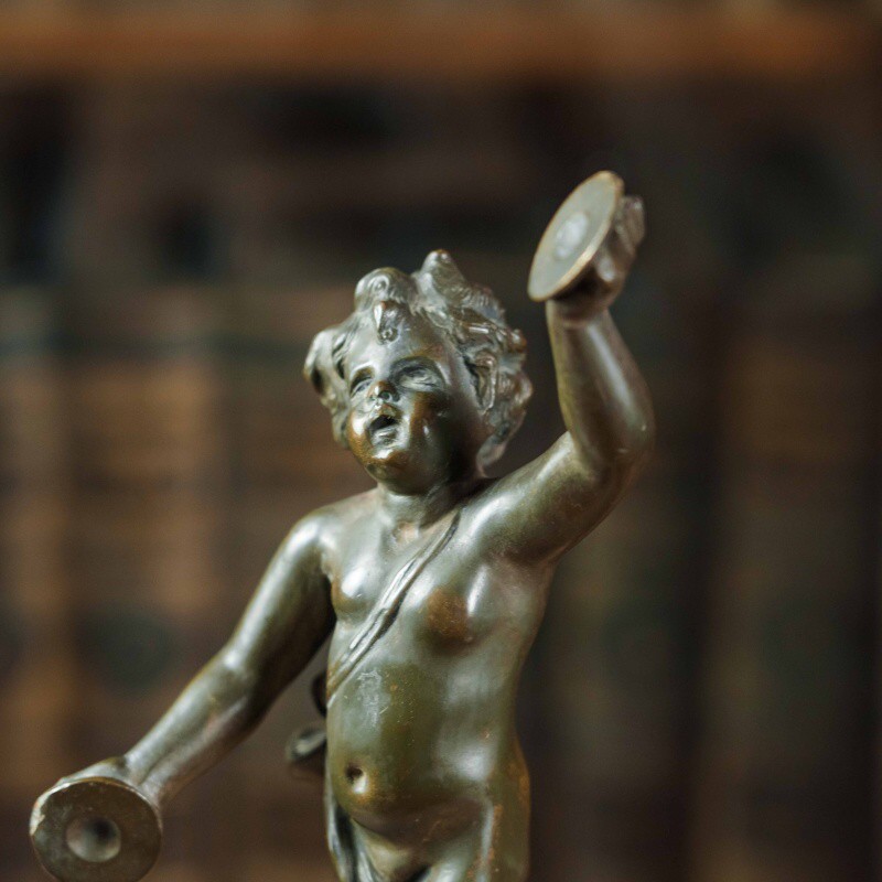 Изящная бронзовая скульптура изображает юного амура, радостно танцующего и играющего на цимбалах в руках. Его лёгкая поза, мягкие очертания тела и живая мимика передают ту грациозную игривость, которой славились произведения Клодиона — одного из крупнейших мастеров французского рококо.