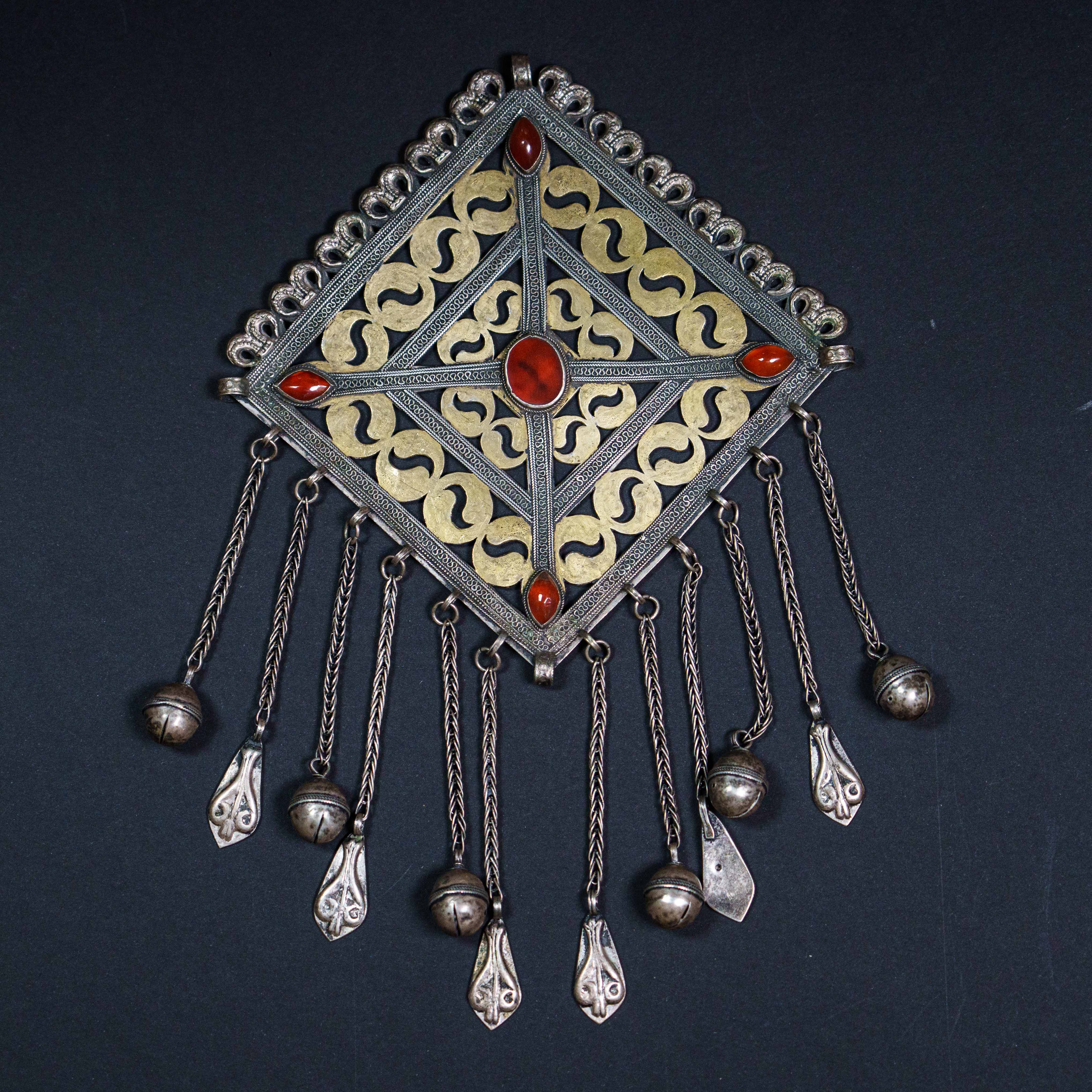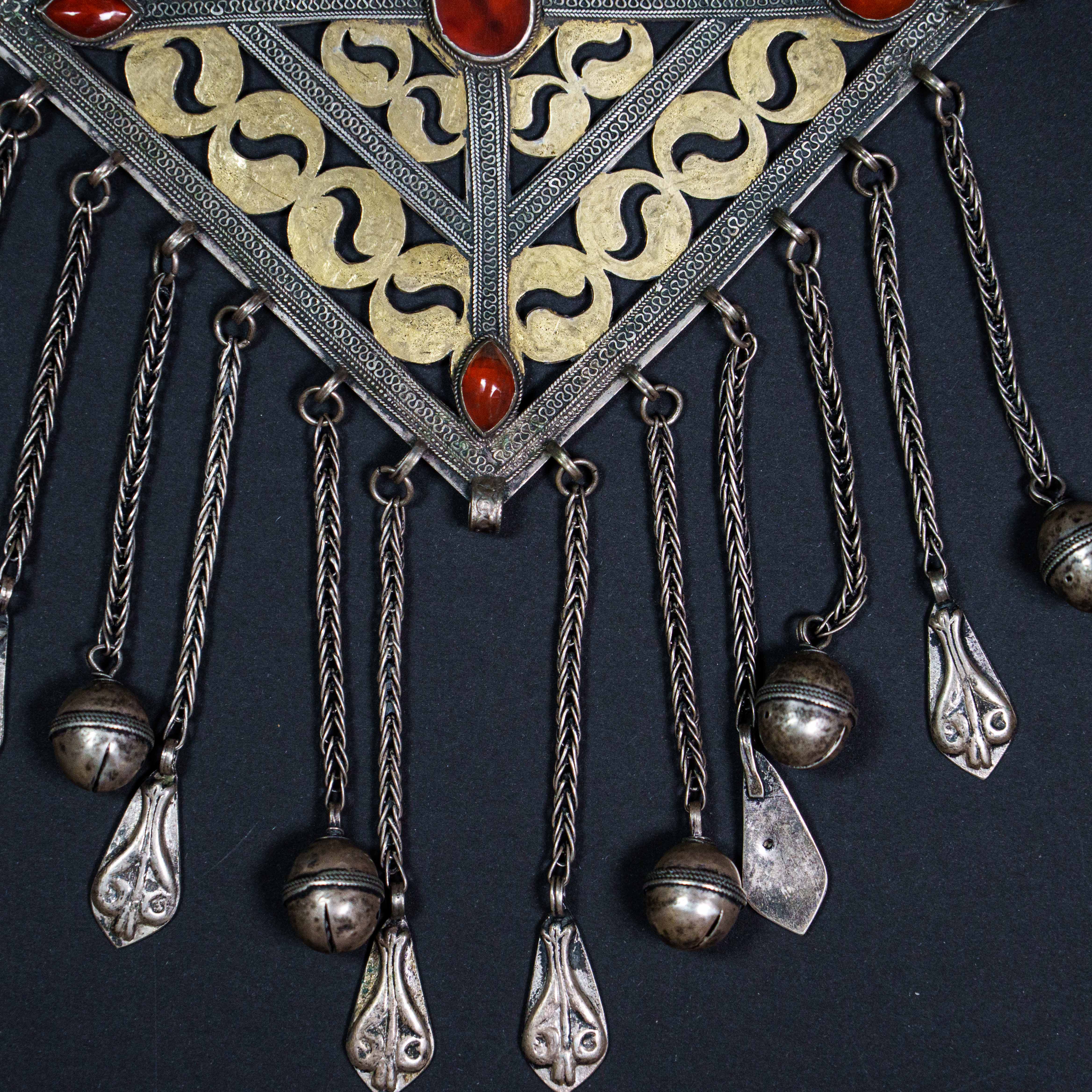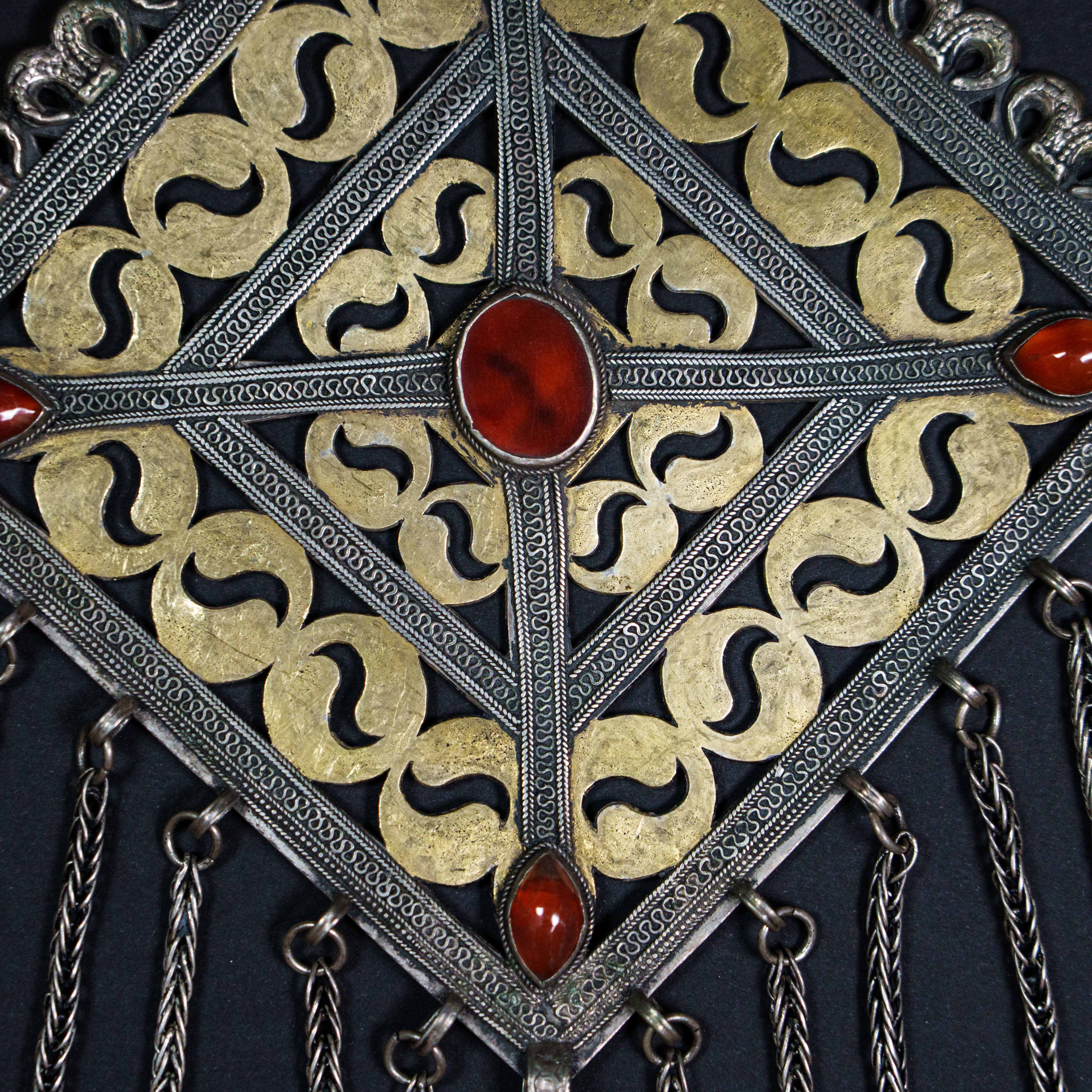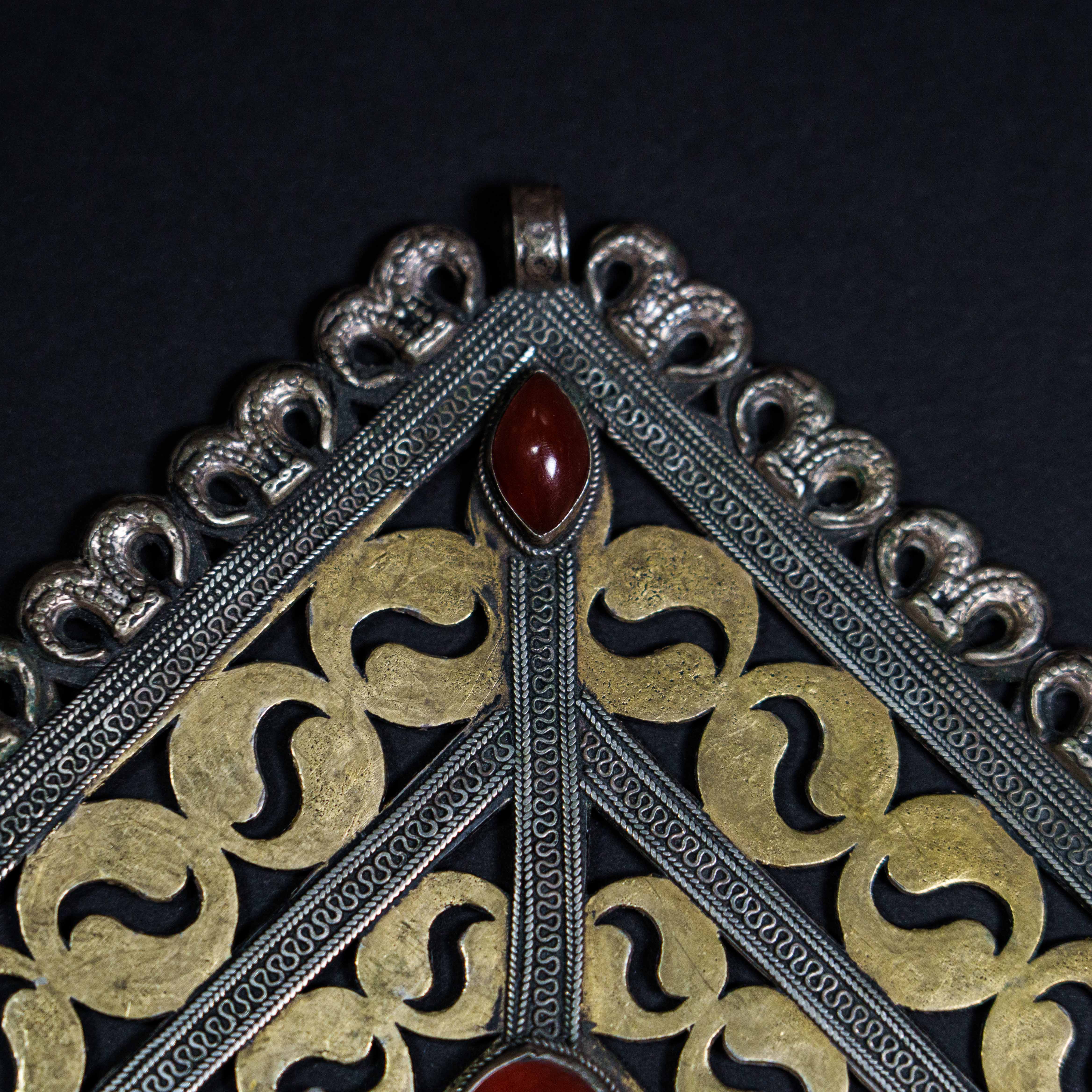 Нагрудное украшение Гульяка имеет ромбовидный вид броши с фестончатым краем, сквозным прорезным узором в виде сердечек и стреловидных фигур, множества и камней, мягкий блеск которых оттенялся позолоченным геометризованным растительным орнаментом.