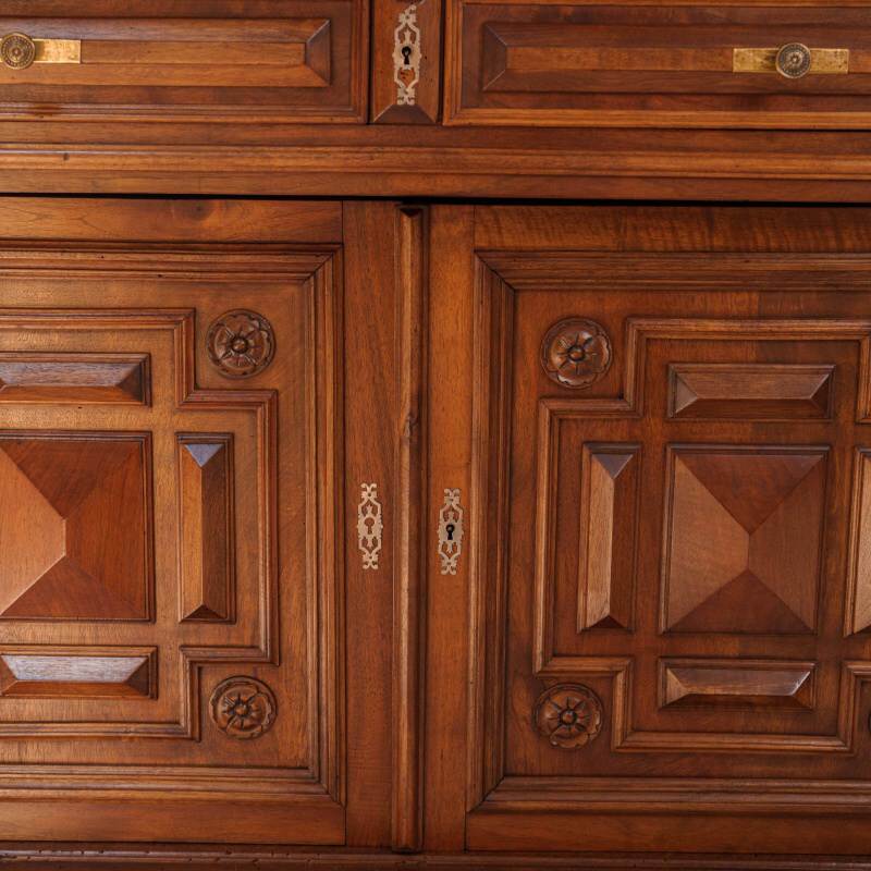 Перед вами выразительный антикварный буфет в стиле Ренессанс, отличающийся монументальностью, архитектурной строгостью и богатством резного декора.