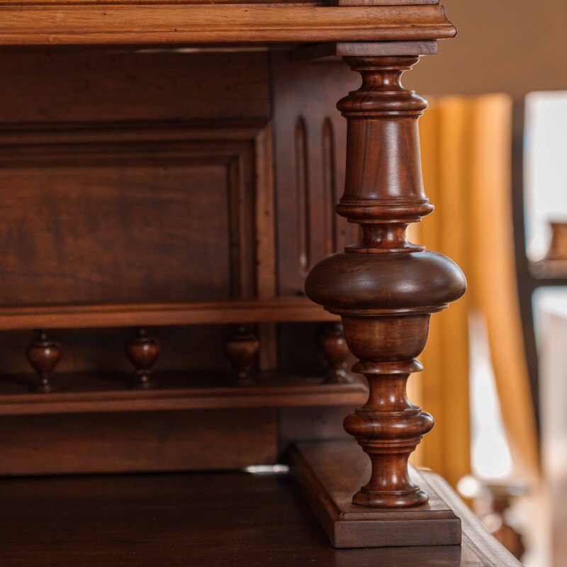 Он словно повторяет формы дворцовой мебели XVI века, где каждая линия подчинена гармонии и симметрии. Конструкция буфета двухъярусная: верхняя часть возвышается над нижней, образуя внушительный силуэт, напоминающий фасад старинного кабинета.