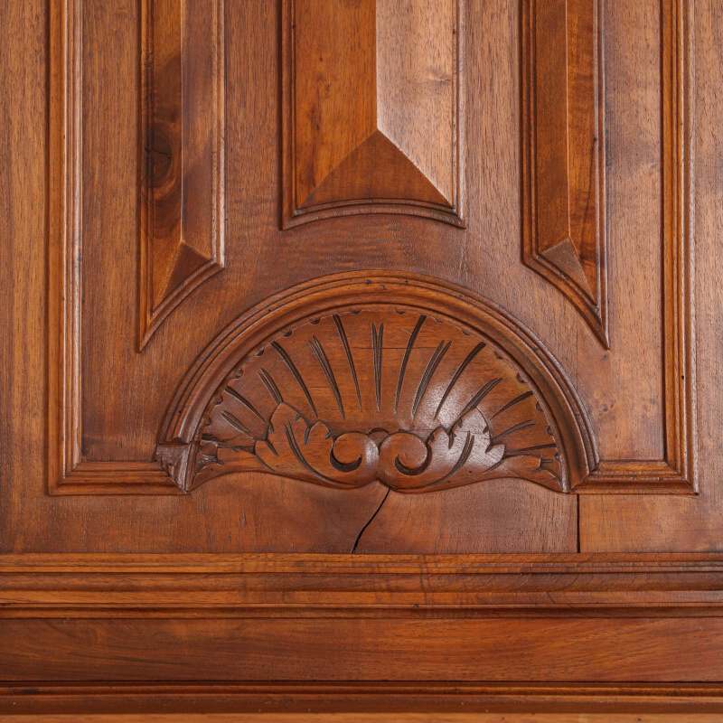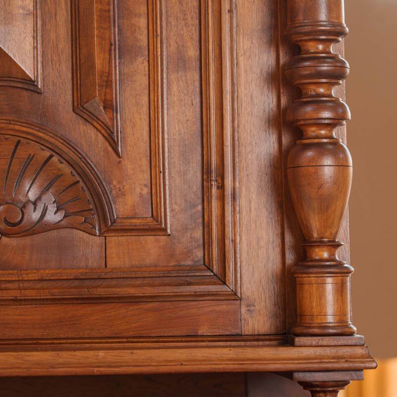 Верх увенчан строгим карнизом с балюстрадой — редкой и особенно эффектной деталью, придающей предмету парадность и завершённость. Ниже расположены массивные створки с глубокими филёнками, украшенными геометрической и арочной резьбой, характерной для ренессансной традиции.
