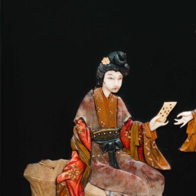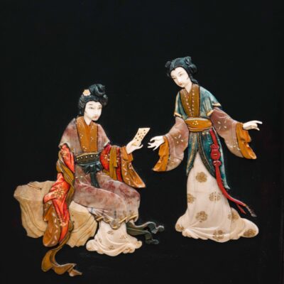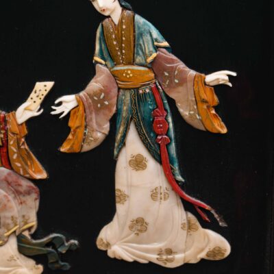 Дерево, ручная резьба, инкрустация натуральными камнями, костью.