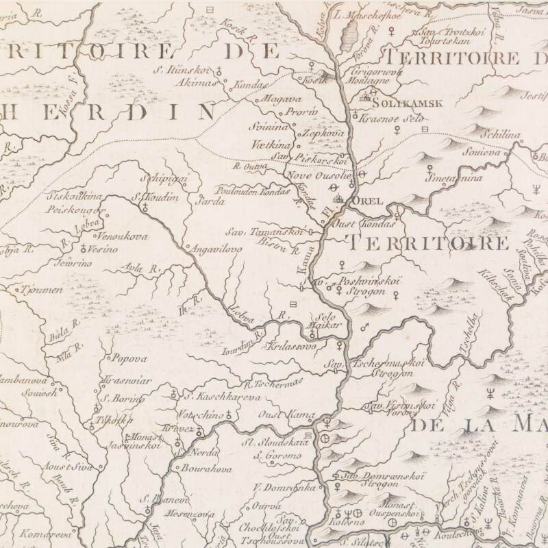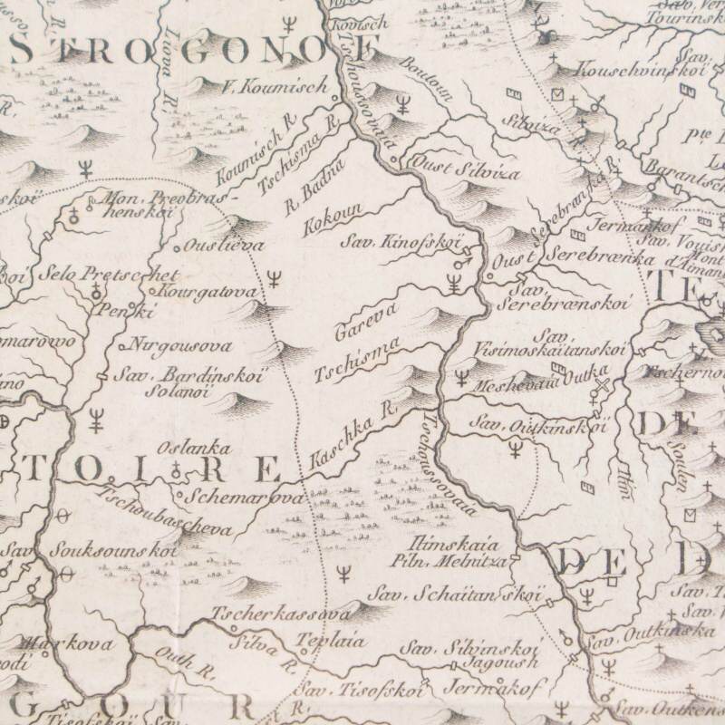 Карта охватывает большую часть Уральского горного региона, простирающегося от истоков реки Белая до реки Сосьва. На карте указаны территориальные деления, такие как: Чердынь, Соликамск, Казань, Сибирь и др. регионы, которые обозначают владения или административные округа.