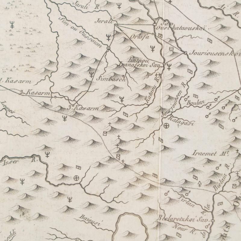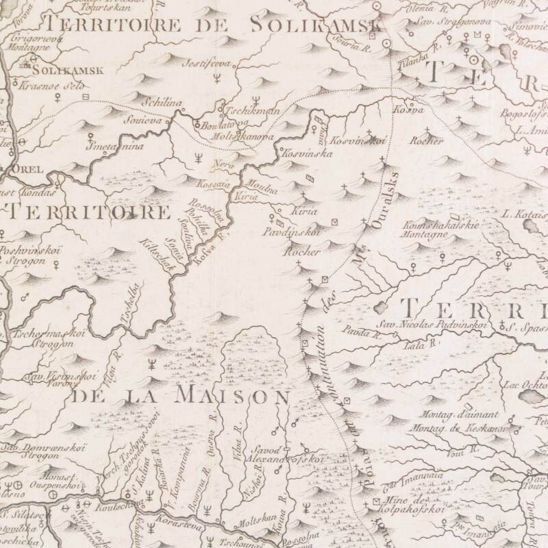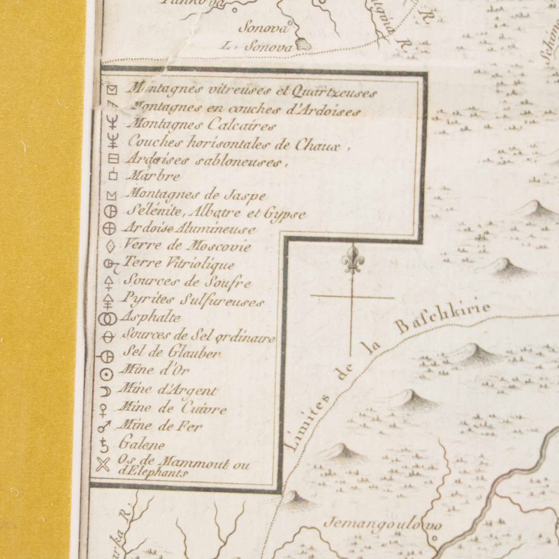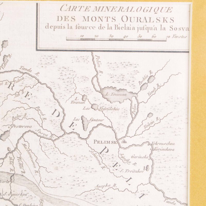 Минерологическая карта Уральских гор, опубликованная во французском издании книги Питера Симона Палласа «Путешествие профессора Палласа по разным провинциям Российской империи и Северной Азии», является важным географическим и научным документом. В своей книге Петр Симон Паллас описывает свои исследования и наблюдения, которые он проводил во время экспедиции по Уралу и другим регионам Российской империи в конце XVIII века. Данная карта была создана для того, чтобы представить богатство и разнообразие минералов, найденных в Уральских горах. Паллас, будучи натуралистом, уделял большое внимание изучению местных ресурсов, в том числе горных пород, полезных ископаемых и флоры.