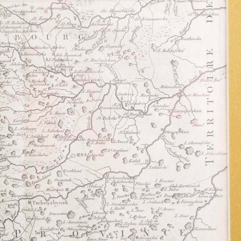 Уральские горы четко изображены как горная цепь, проходившая с севера на юг, с использованием штриховки для обозначения высоты. На карте указано множество названий мест, рек и региональных обозначений на французском языке.