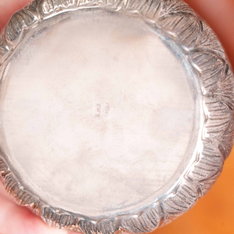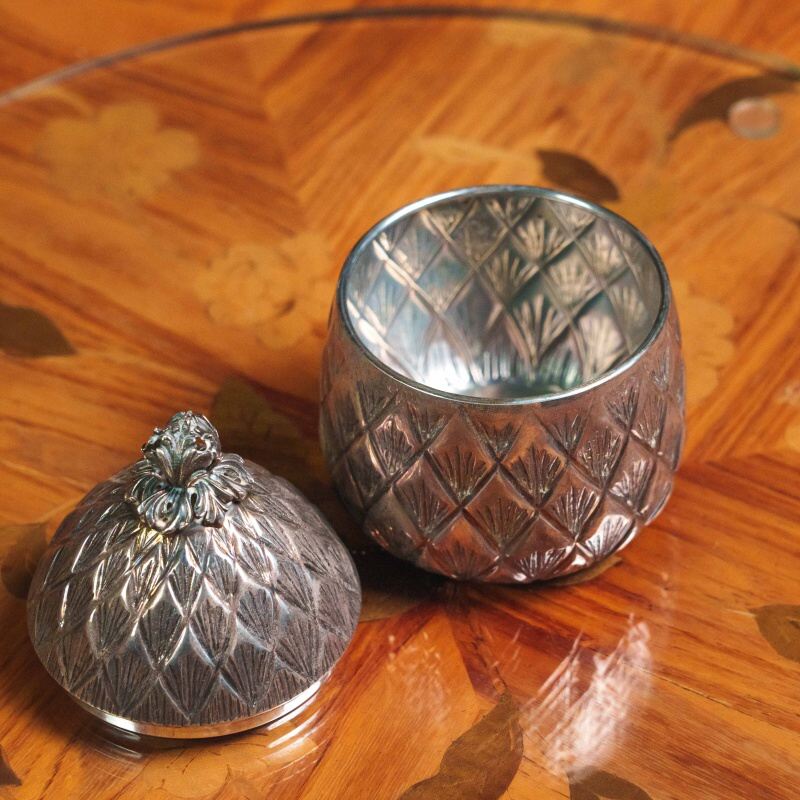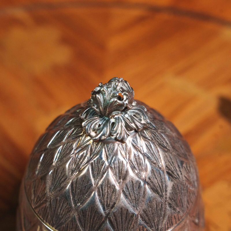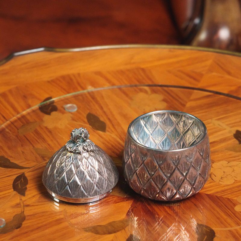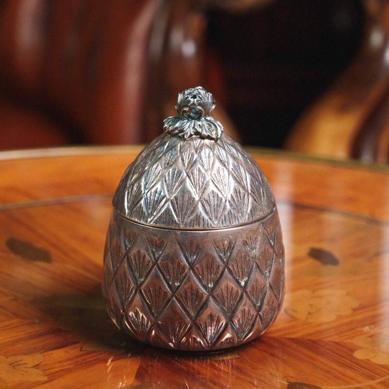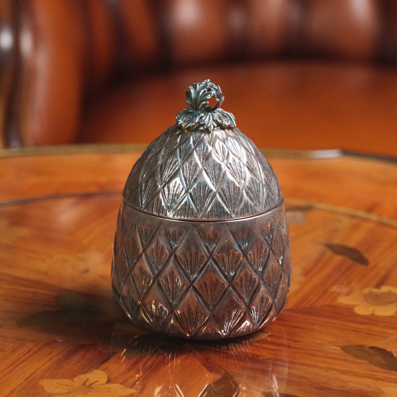 Чайница в виде ананаса, изготовленная ювелирной мастерской Fani Argenti Antichi e Moderni S.R.L. Изделие выполнено из серебра и представляет собой образец итальянского искусства, сочетающего традиции ручной чеканки и современную эстетику. Корпус и крышка украшены рельефным орнаментом в форме ромбовидных листьев, создающих эффект сложной текстуры, а навершие в виде стилизованного цветка придаёт композиции изысканную завершённость. Внутренняя поверхность гладкая, что позволяет использовать чайницу по прямому назначению — для хранения чая или мелких сладостей. Подобные предметы характерны для фирменного стиля мастерской Fani, известной своими высокохудожественными серебряными изделиями, объединяющими классику и декоративную выразительность ручной работы.