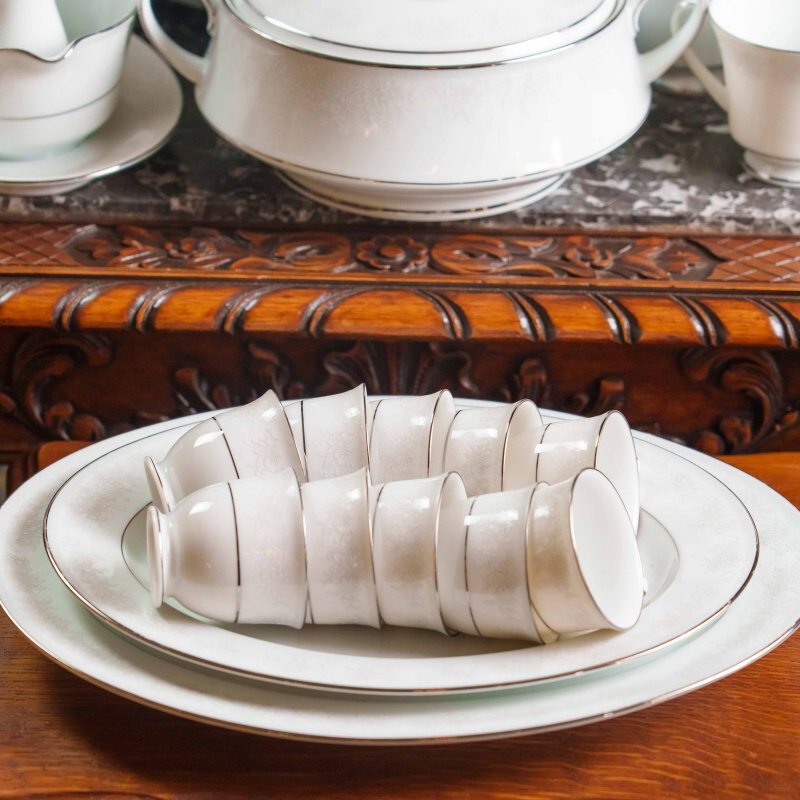 Белоснежный фарфор украшен тонким рельефным орнаментом и аккуратной платиновой отводкой по краю, придающей сервизу элегантный и универсальный характер.