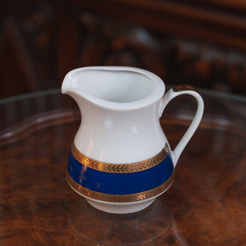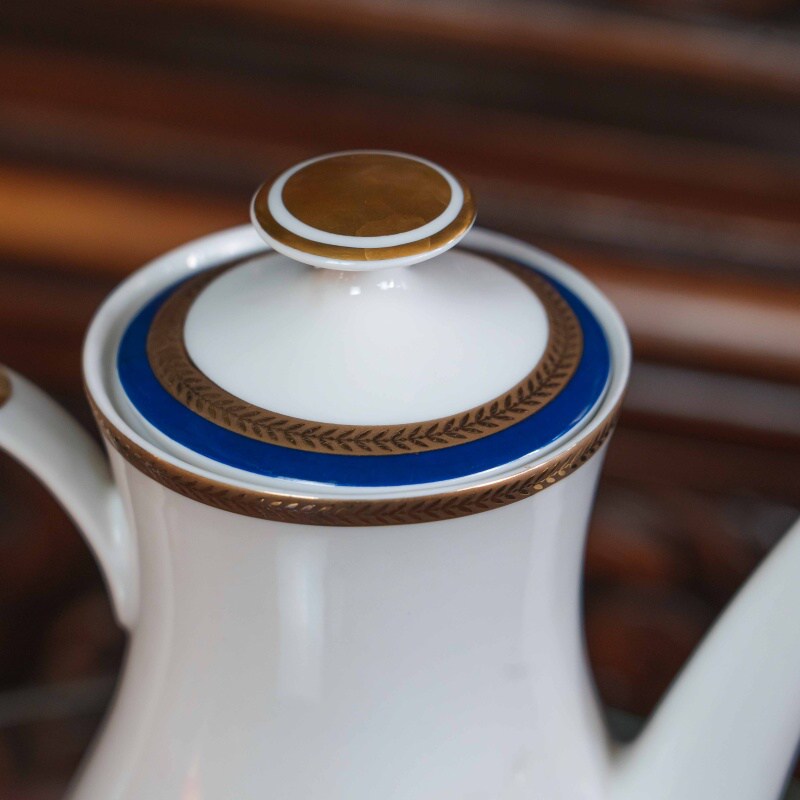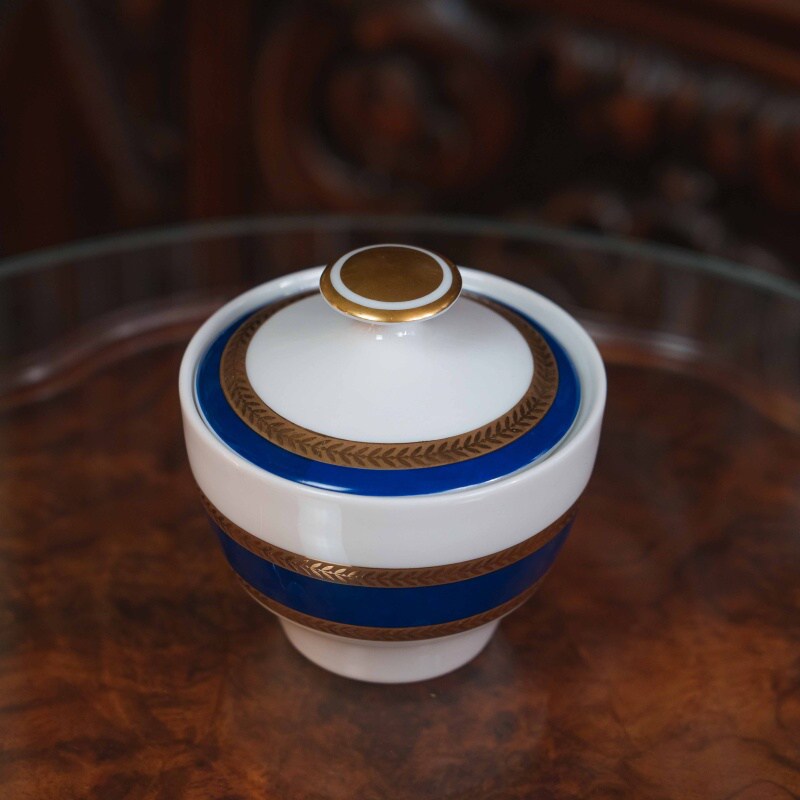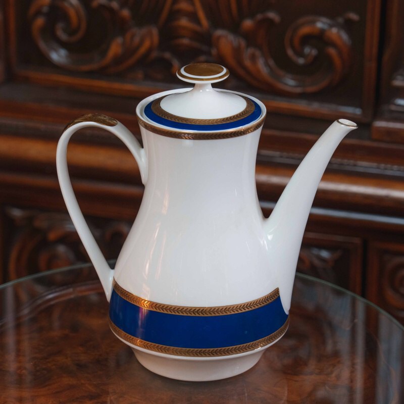 Дизайн представлен контрастом чистого белого фарфора и насыщенного кобальтового пояса, обрамленного тонким золотым орнаментом.
