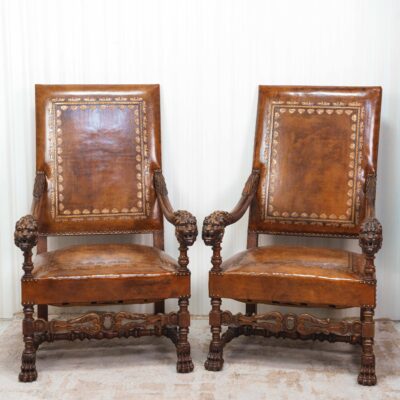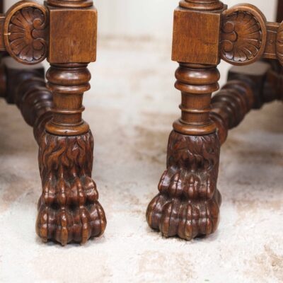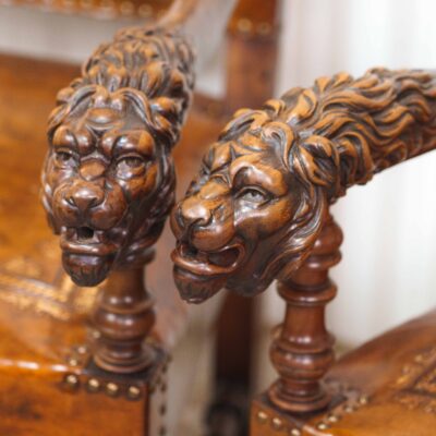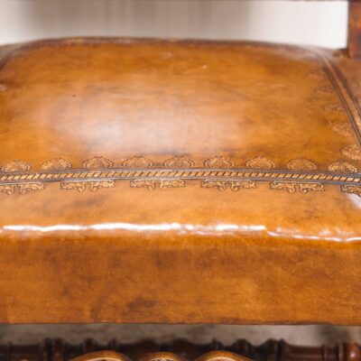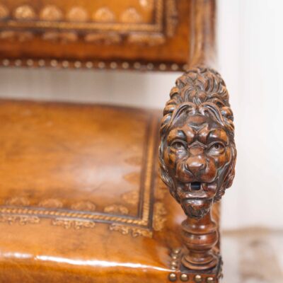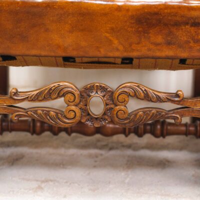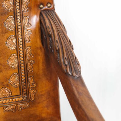 Дерево, ручная резьба, натуральная кожа с тиснением.