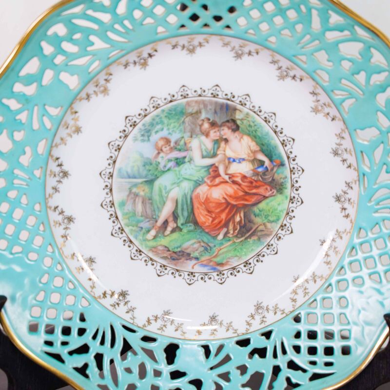 Сочетание бирюзовой ажурной каймы, золочения и пасторального сюжета создаёт гармоничный, декоративно выразительный образ. Тарелка прекрасно смотрится как настенное украшение или как акцент в витрине, добавляя интерьеру нотку европейской романтики и утончённого вкуса.